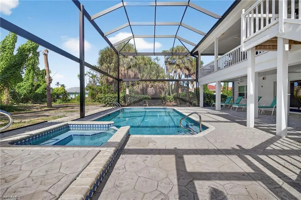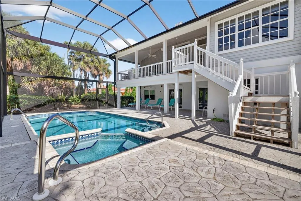 The primary suite is tucked privately to one side of the home and includes a balcony, a spacious walk in closet, and a well appointed bath with double sinks, a separate shower, and a soaking tub. On the opposite side of the home, two additional bedrooms and a full bath offer comfortable guest accommodations. One of these rooms is currently used as an office and opens through French doors to the pool area, providing a seamless indoor outdoor connection.