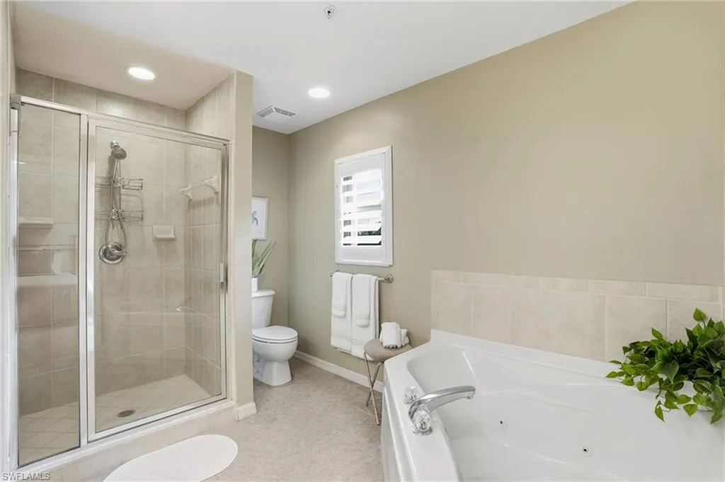 The primary suite features a walk-in closet and a luxurious bath with double sinks and a relaxing jetted tub. The guest wing offers two additional bedrooms and a full bath, which can be closed off for privacy.