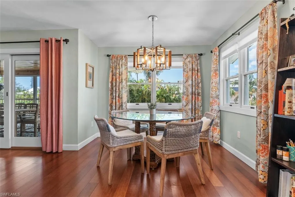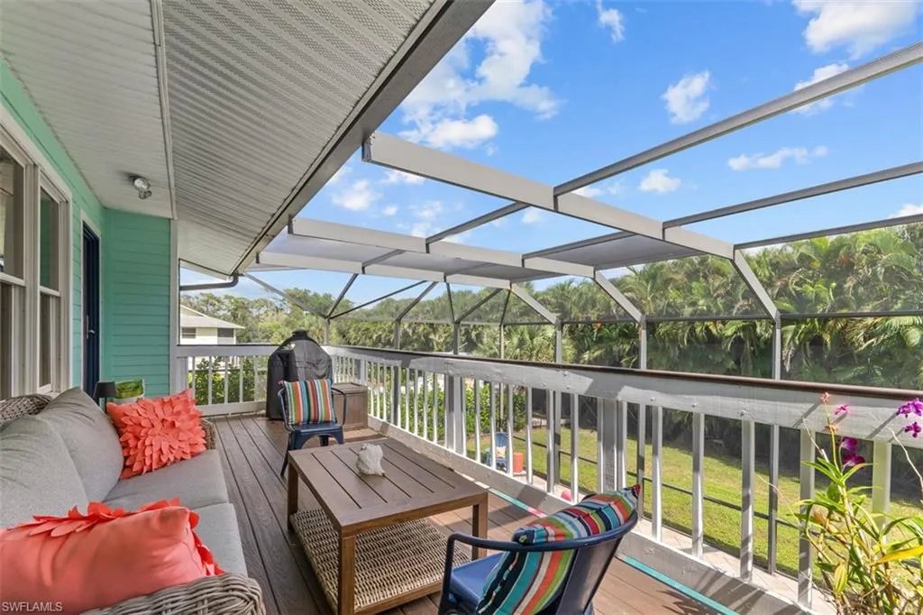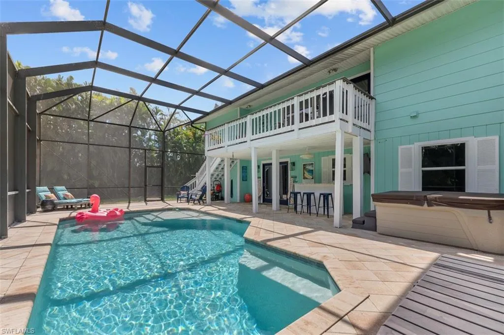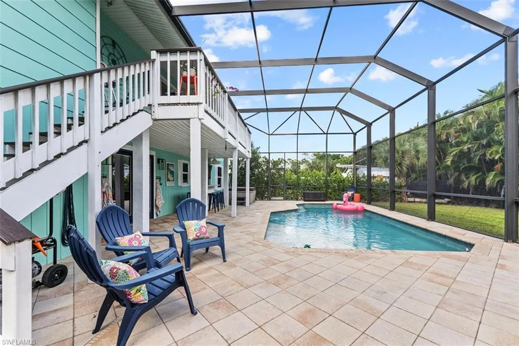 Step out onto a covered lanai, where tropical foliage frames your private sanctuary. Whether you’re lounging with a book, entertaining around the outdoor bar, or swimming laps in a sparkling saltwater pool, this expansive .30-acre lot provides the perfect canvas for outdoor living. The back yard is completely fenced in with a large side gate, suitable to provide access for storing a boat or RV. Sunsets glow golden on the screen front lanai, perfect for dining or relaxing the day.