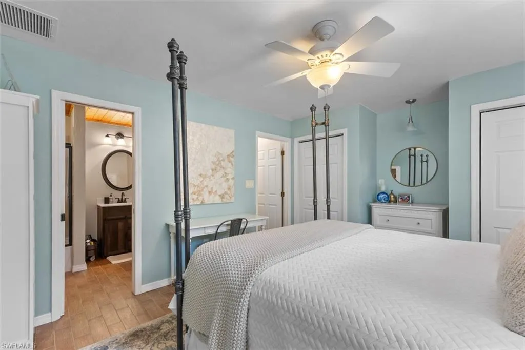 Retreat to the primary suite, where you’ll find your sanctuary complete with en-suite bath and plenty of closet space, with French doors opening out to your screened pool oasis. Two additional bedrooms, with full baths, offer flexibility for family, guests, or a work-from-home studio.