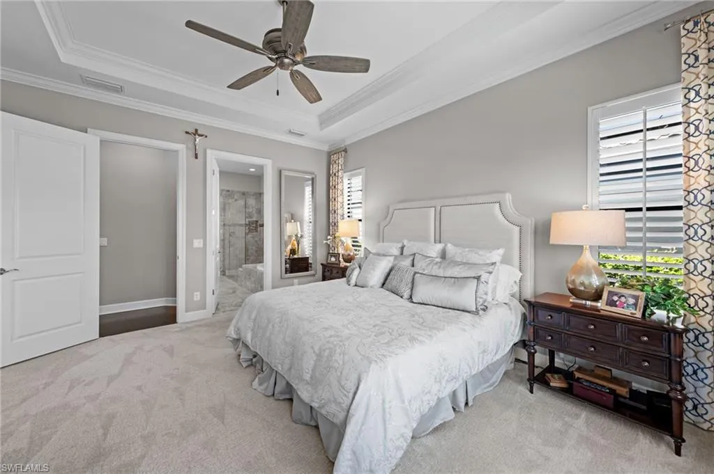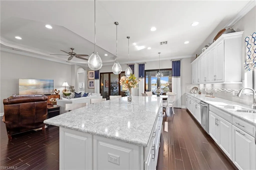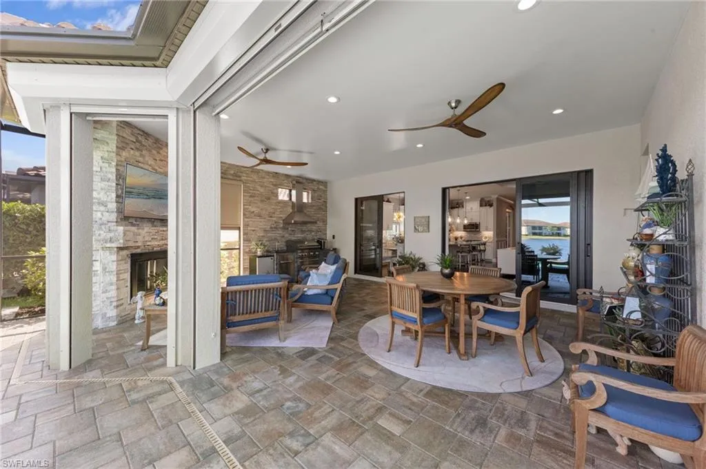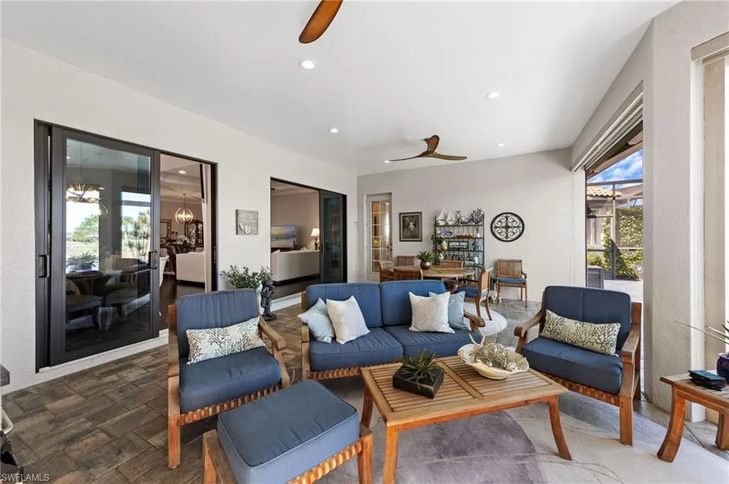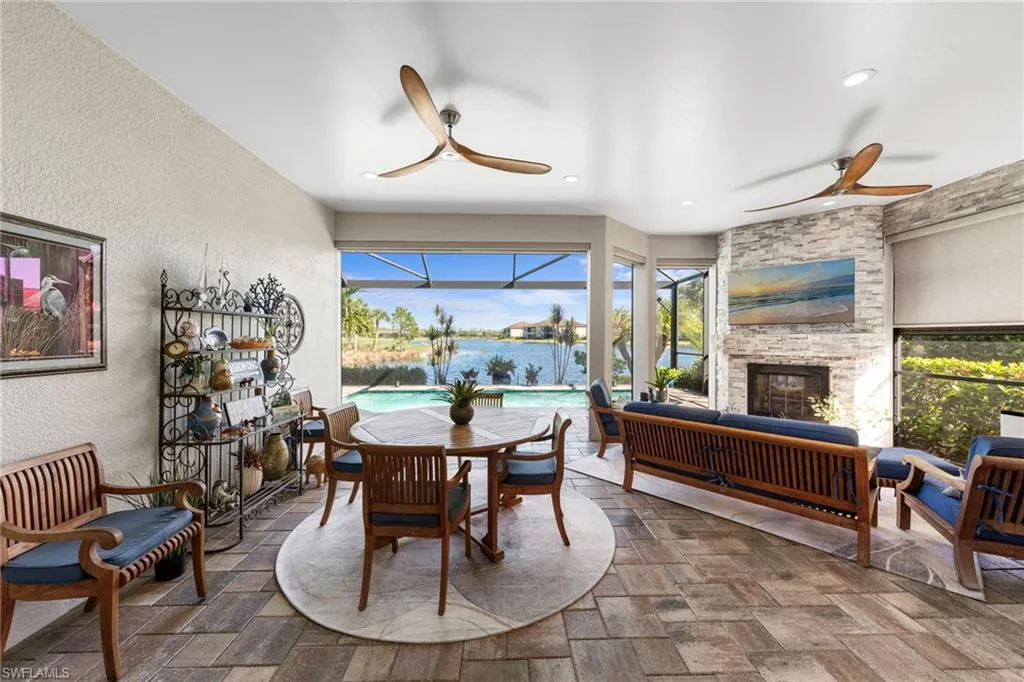 LIVE THE GOOD LIFE AT ESPLANADE GOLF AND COUNTRY CLUB! GOLF MEMBERSHIP INCLUDED!!! Experience resort-style living in one of Naples most sought-after Golf and Country Club communities. This stunning Lazio-style home offers SERENE LONG LAKE AND GOLF COURSE VIEWS with exceptional privacy, creating the perfect setting for relaxed luxury. A beautifully landscaped entry welcomes you inside to a bright, open-concept floor plan featuring a spacious great room and dining area seamlessly connected to an extended, gourmet kitchen. Enjoy white cabinetry, quartz countertops, stainless steel appliances, a natural gas cooktop, and a charming breakfast nook—ideal for everyday living or entertaining. Custom window treatments and warm wood flooring throughout the main living area complete the home’s look of comfortable sophistication. The primary suite offers a private retreat with a spa-inspired bathroom featuring dual vanities, a walk-in shower, soaking tub, and a generous walk-in closet. Two guest suites, each with its own private bath, ensure comfort and privacy for overnight visitors, while the den provides flexible space for a home office or sitting room. Step through two sets of sliding glass doors to the outdoor living area with picture window screening, designed to maximize lake and golf views . El fresco entertaining is effortless with with a well equipped outdoor kitchen, and relaxing on cool nights is comforting by the gas fireplace with stone surround. The heated pool beckons you for an afternoon swim. This cozy outdoor living area offers the perfect venue for morning coffee, afternoon swims, or evening gatherings. Additional features include: Hurricane shutters and screens for extra protection of covered lanai area and year-round comfort, IMPACT WINDOWS AND DOORS THROUGHOUT for peace of mind, and additional 2025 improvements including a professionally epoxied garage floor, new pool filter, new microwave, new garbage disposal, and extensive landscaping.