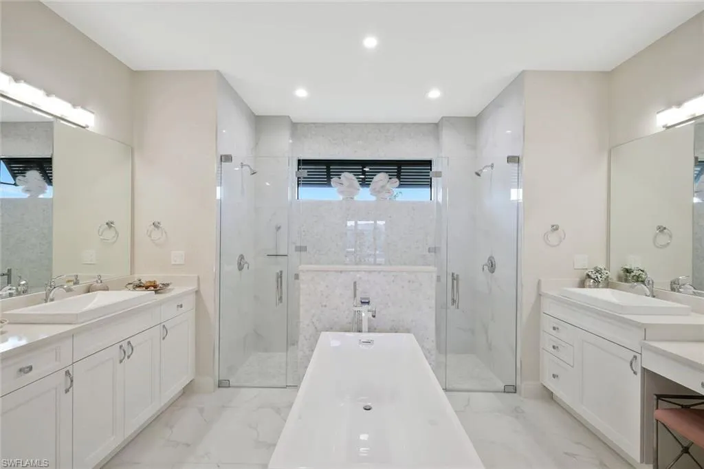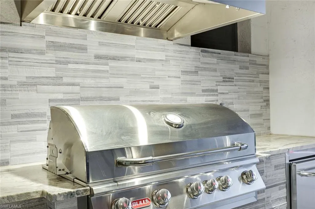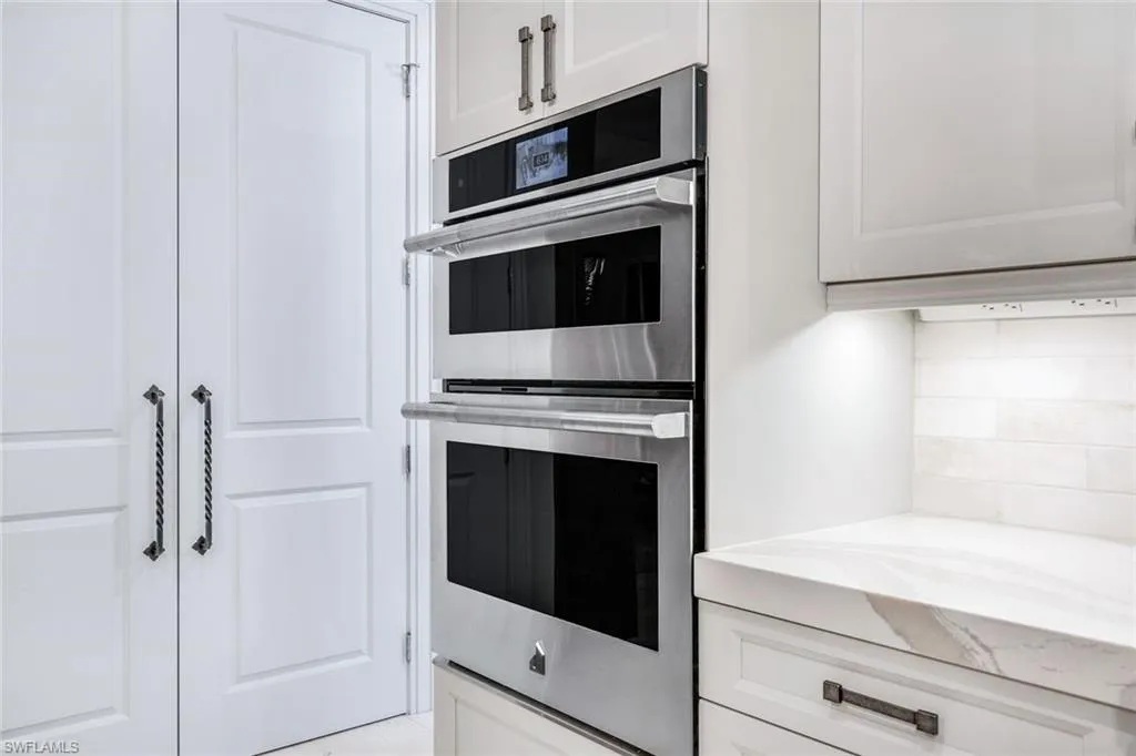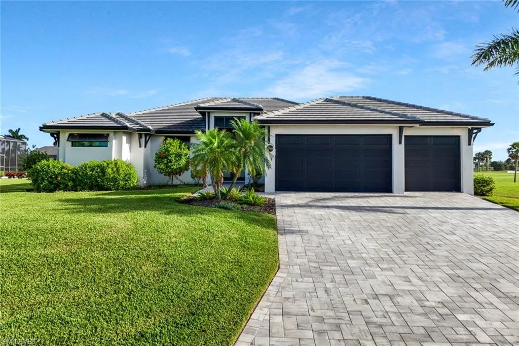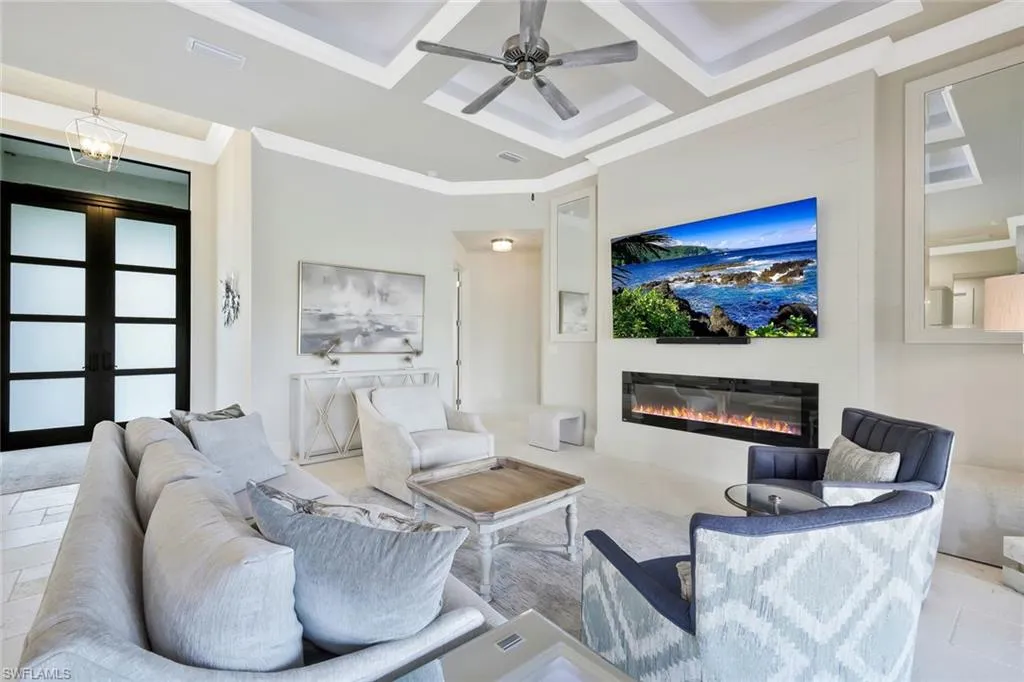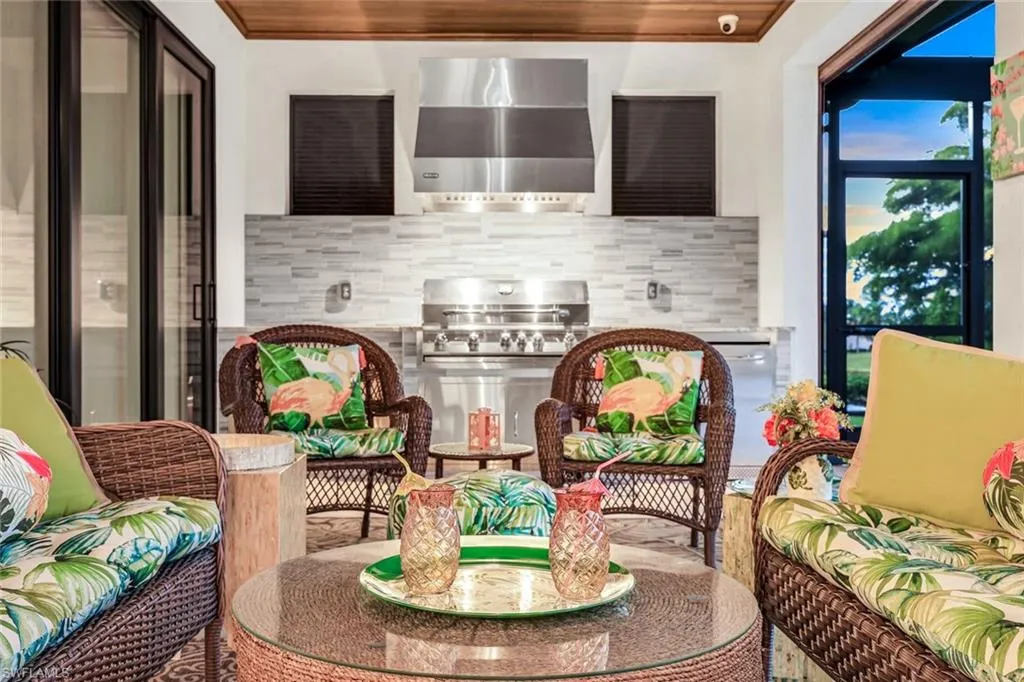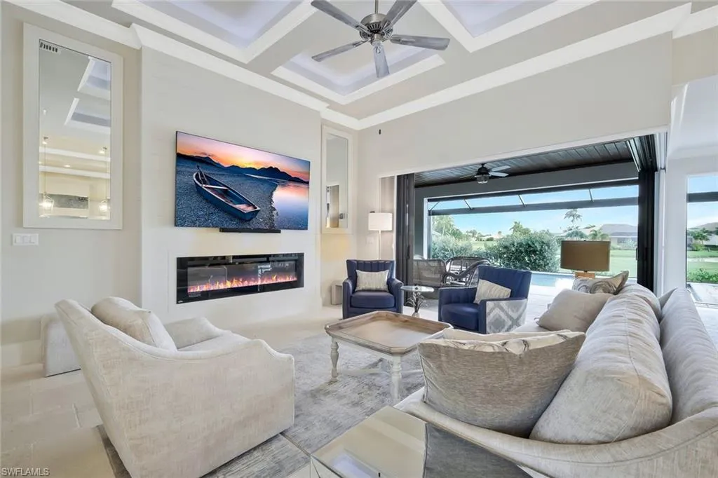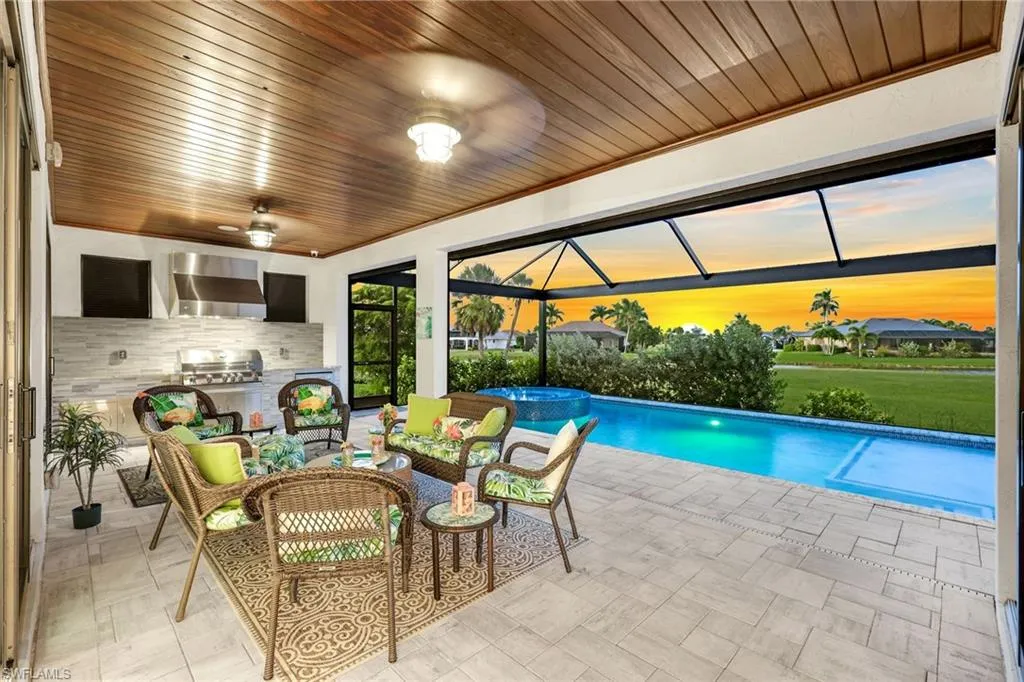 Welcome to this exquisite designer-decorated and fully furnished residence located within the prestigious Cape Royal Golf & Country Club. Cape Coral’s premier gated golf community offering 27 holes of championship golf, low HOA fees, and no mandatory golf membership. From the moment you enter, this home delivers the “wow” factor with stunning attention to detail and timeless elegance throughout. Travertine tile flooring flows seamlessly through the main living areas, while soaring ceilings, custom millwork, and curated finishes create a sense of refined sophistication. The gourmet kitchen is a chef’s dream, featuring a large center island, high-end Dacor appliances, custom cabinetry, and a gas cooktop—perfect for entertaining or intimate evenings at home. The open floor plan connects the kitchen, dining, and living spaces effortlessly, with 90-degree disappearing sliders that extend the living area to the lanai, capturing panoramic golf course views and bringing the outdoors in. The living room offers a coffered ceiling, an elegant electric fireplace, and designer lighting that adds warmth and character. The formal dining area is enhanced by a tongue-and-groove ceiling and decorative lighting, creating the perfect setting for unforgettable dinners and celebrations. The luxurious primary suite is a private sanctuary featuring a tray ceiling, plantation shutters, rich wood flooring, and direct access to the lanai. The spa-inspired primary bath offers dual vanities—one with a dedicated makeup station—a large soaking tub, and an oversized walk-in shower with dual shower heads. The split-bedroom floor plan ensures privacy for guests, and each guest bath has been thoughtfully designed with high-end finishes and tasteful decor. Step outside to your private resort-style lanai, where relaxation and entertainment meet in perfect harmony. The extended under-truss seating area boasts a tongue-and-groove ceiling, decorative ceiling fans, and a full summer kitchen with a built-in gas grill—ideal for outdoor dining and gatherings. The electric-heated saltwater pool features a sun shelf and a large spa, inviting you to unwind while enjoying the serene golf course backdrop and stunning Florida sunsets.
