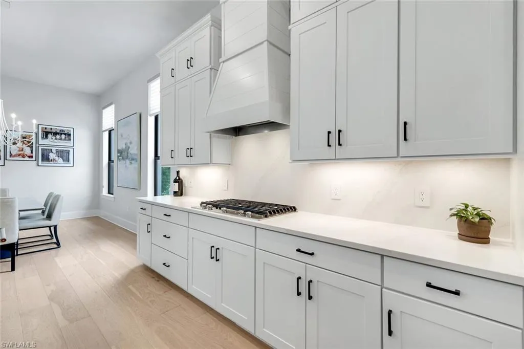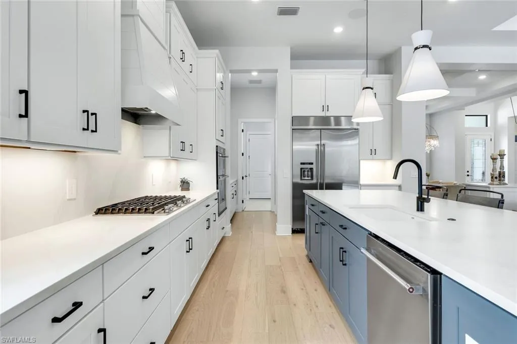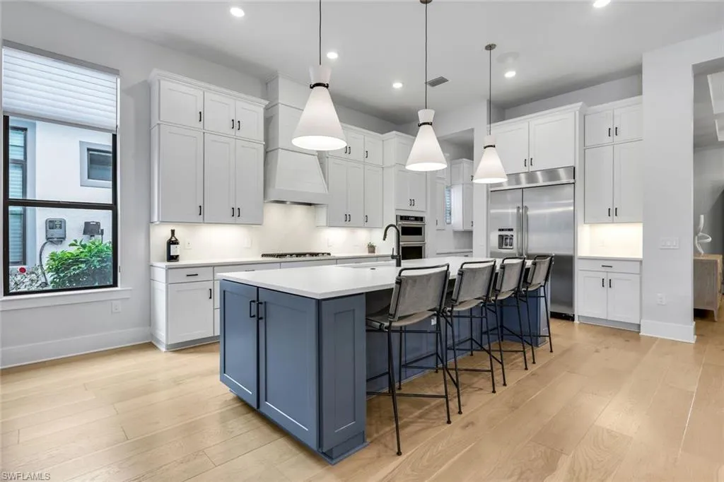 Designed for both everyday living and effortless entertaining, the open-concept floor plan is accentuated by 12–14′ ceilings throughout, abundant natural light, and 10′ sliding glass doors that open seamlessly to the lanai. The gourmet kitchen showcases an 11-foot island, a spacious walk-in pantry, a convenient butler’s pantry, and gas cooking — all flowing into the expansive great room and elegant formal dining area with a custom bar and buffet.