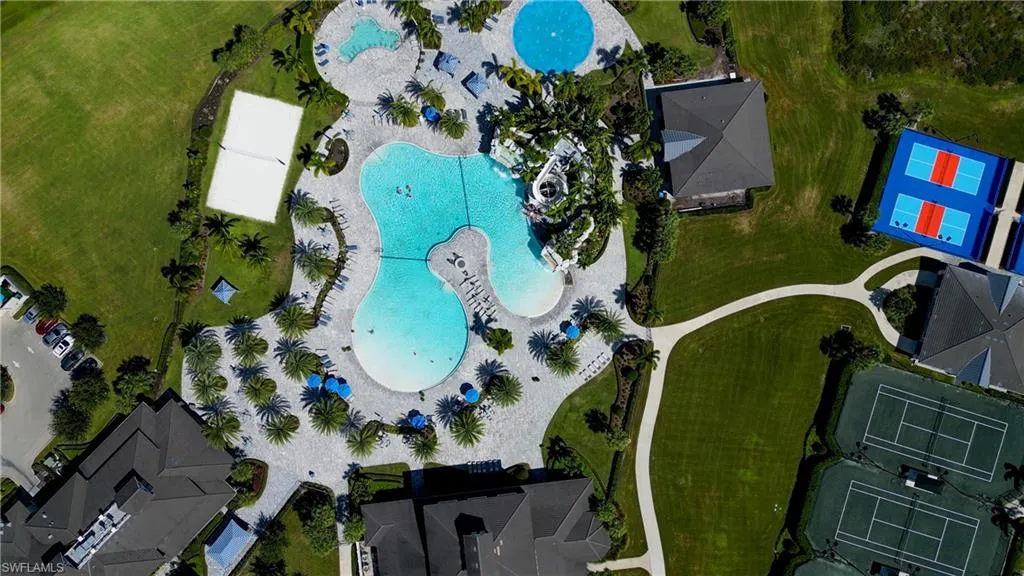 Residents of The Place at Corkscrew enjoy a resort-style experience featuring a grand clubhouse, two on-site restaurants, multiple bars (Bourbon cocktail bar, sports bar, and outdoor pool bar), deli and coffee shop, family splash park, lagoon pool with waterfalls, 100-foot waterslide, swim spa hot tub, sand beach, beach lounge chairs, private cabanas, fire pit, tennis courts, pickleball courts, bocce, sand volleyball court, basketball court, dog park, playground, and a 24-hour fitness center with Pilates room. The community also offers on-site day care, low HOA fees, and a gated neighborhood providing an exceptional Southwest Florida lifestyle.