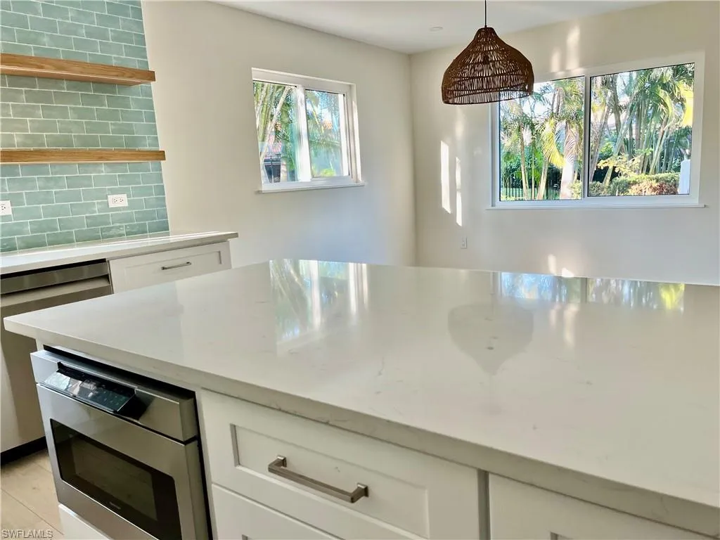 This beautifully remodeled first floor condo offers a perfect blend of modern elegance and coastal charm. Featuring two spacious bedrooms, with the main bedroom offering ensuite bathroom and large walk in closet. Guest bedroom conveniently located near the 2nd bath. All rooms have large windows to allow natural Naples sunshine in. The washer dryer is conveniently located in Guest bedroom closet for quiet use. Open floor plan creates a seamless flow throughout the living spaces. Amazing kitchen boasts stunning quartz counters with ample space to move around, stainless steel appliances, lighted shelving, custom backsplash, making it a joy to cook and entertain. The large island/counter allows for casual meals or setting up your laptop. The inviting living room has coat closet, wine bar area, and opens up to large outdoor screened in lanai. The lanai overlooks lush landscaping, while all the doors and windows are impact resistant. Relax in privacy.