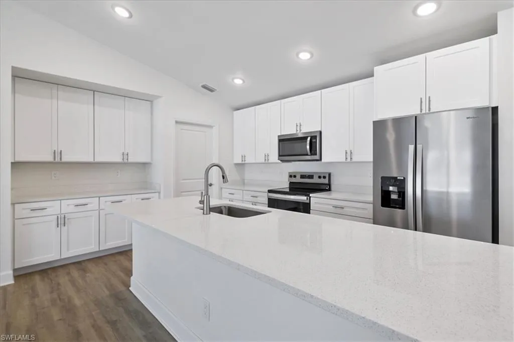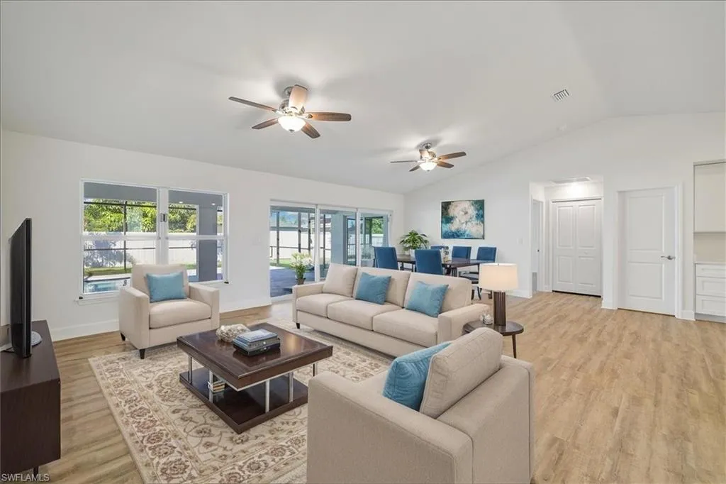 BRAND NEW PRIVACY FENCE JUST INSTALLED!! SPACIOUS POOL HOME WITH DUAL PRIMARY SUITES! Welcome to the Paradise Cove Plan—a stunning, expansive retreat designed for comfort and elegance! This huge 4-bedroom, 3-bath home boasts two luxurious primary suites, making it perfect for multi-generational living or accommodating guests in style. Step inside to discover an open-concept great room with soaring ceilings and a 12-foot triple slider, seamlessly blending indoor and outdoor living. The heart of the home is the gourmet kitchen, featuring soft-close, all-wood cabinetry, quartz countertops, stainless steel appliances, and an oversized walk-in pantry—a dream for any chef! The first primary suite is a private oasis, spacious enough for a king-size bed and a cozy seating area. Enjoy direct access to the lanai and pool, plus a spa-inspired ensuite with a freestanding soaking tub and separate shower. The second primary suite is equally impressive, offering a full bath that also serves as a convenient pool bath, along with a generous walk-in closet. Outside, relax in the 1,100 sq. ft. under-truss screened lanai or take a dip in the heated pool, perfect for year-round enjoyment. Built by a trusted local builder, this home offers incredible value in Cape Coral with impact windows for added security and lower insurance costs, no flood zone offering peace of mind and savings, and a 10-year structural warranty for long-term confidence. Fence options available—ask for details! This is The Paradise Cove Plan.
