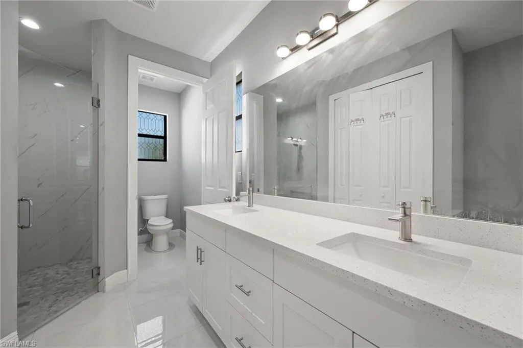 The den is versatile and perfect for a home office or additional living space, offering flexibility to fit your lifestyle. The chef-inspired kitchen features 42” solid wood white cabinetry, luxurious quartz countertops, and stainless steel appliances, creating a bright and functional space ideal for gathering. Both bathrooms are equally refined, showcasing quartz surfaces and a huge primary shower with a frameless glass door for a spa-like experience.