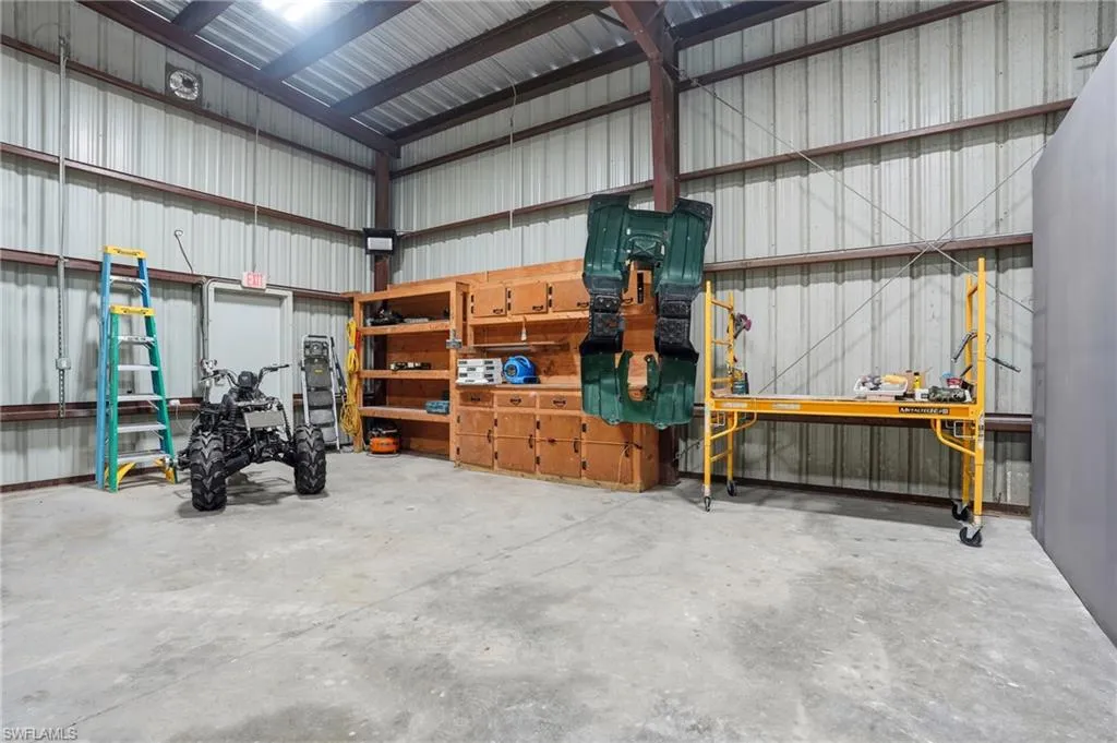 Private warehouse with attached living and office space located behind the main residence at 6070 Lancewood Way in Naples. This versatile metal building offers approximately 2,668 sq. ft. total, featuring 1,523 sq. ft. of open warehouse area and 1,145 sq. ft. of air-conditioned living/office space.