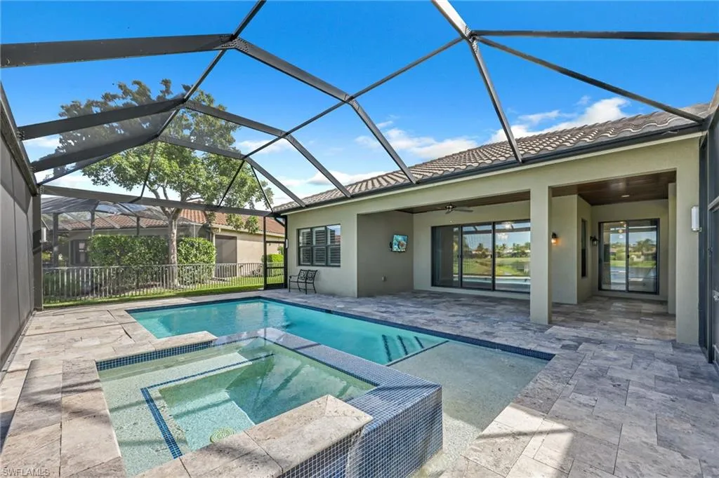 Stone Creek is a highly desirable gated community, this home offers four bedrooms, three bath, two car garage with overhead storage. This home is well maintained waterfront pool home. Cozy entertainment room and large open living area off the eat in kitchen. Crown Molding throughout, plantation shutter, epoxied garage floor and numerous up-grades that must be seen to appreciate. Entertain family and friends on the screened large lanai around the pool. The community center also has a fitness area, swimming pool, pool table and an indoor basketball court. Amenities galore at Community center.