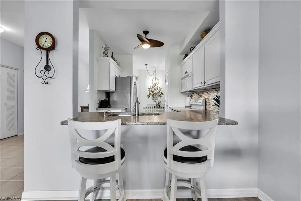 Charming first floor Golf Membership condo with amazing Golf course views!! This beauty is in the desirable neighborhood of Farrington/Wellington and nicely situated close to the cul-de-sac and only steps to the pool and Clubhouse!! Beautiful Quartz counters in the kitchen with knock down of the barstool area for expansive counter space. French door refrigerator, double deep ss sink and custom backsplash, new carpet in both bedrooms and laminate flooring in the living room, water heater in 2023, large master bedroom with bump out, seamless glass shower door, updated light fixtures and nicely painted and decorated in a coastal theme. Sit back on your relaxing tiled lanai while enjoying spectacular golf views of two holes and the water, along with amazing sunsets!! You’re sure to have peace of mind with remote controlled storm shutters on your lanai. Wait there’s more.. This beauty is being offered Turnkey and ready for immediate occupancy!!The Legends is a prestigious private country club w/ a 30,000+ sq ft Clubhouse offering fine dining, a casual sports pub & a stunning outdoor Sunset Grill!! Tons of amenities to choose from such as tennis, championship golf, bocce ball, pickle ball, a huge lagoon style pool w/ a waterfall & an exercise facility w/ plenty of classes to choose from. Low carrying costs w/ no cart/green fees & low taxes. Resort Style Living to it’s finest, move in ready and waiting for you to call it home!!