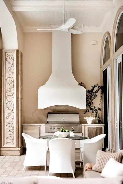 The home features soaring ceilings with crown moldings, arched passageways, expansive windows, and elegant stone flooring throughout the main living areas. The chef’s kitchen is a showpiece, complete with top-of-the-line built-in appliances, Taj Mahal Quartzite countertops, custom wood cabinetry, and a casual dining space. Entertain with ease at the custom Dianna royal marble bar, perfectly positioned for gatherings.