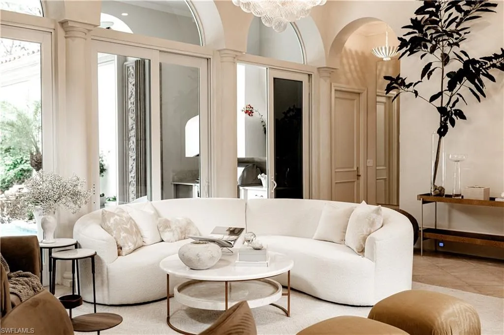 Best deal in Mediterra. No golf. Welcome to this extraordinary, fully renovated villa reimagined by a California superstar designer—an architectural statement that blends timeless Mediterranean elegance with modern luxury. Behind the private gated courtyard, every inch reveals bespoke artistry: one-of-a-kind furnishings, custom millwork, and imported Taj Mahal marble surfaces that exude understated opulence.