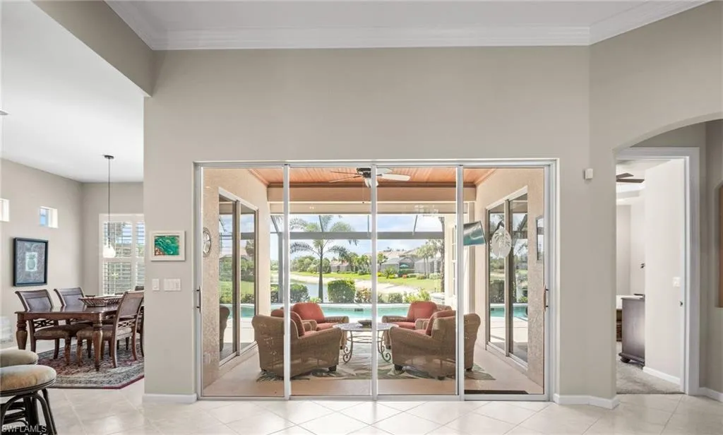 Welcome to this exceptional lakefront and golf-course home in the highly sought-after Caravella neighborhood of Palmira Golf & Country Club. Perfectly positioned on the signature hole Osprey #8, this residence will WOW you from the moment you walk in with its breathtaking long lake views. The most impressive view in all of Palmira! This beautifully and impeccably maintained home offers 3 bedrooms, 2 baths, and 1,920 sq ft of light-filled living space with an open great-room floor plan. Thoughtfully updated throughout, it features plantation shutters, crown molding, tray ceilings, and a completely renovated kitchen with new appliances, quartz countertops, and custom cabinetry. Additional upgrades include a new roof (2022), new A/C (2021), new washer & dryer, central vacuum, and electric hurricane shutters for peace of mind. The spacious screened lanai showcases a custom wood-plank ceiling, picture-frame enclosure, and a sparkling saltwater pool & spa with new pool pump (2023), new heater, and updated spa lighting—a true outdoor oasis designed for entertaining and relaxation. Residents enjoy access to the Renaissance Center Club, offering a lagoon-style resort pool, 75’ Olympic lap pool, 8 hydro-clay tennis courts, 5 bocce courts, pickleball, indoor & poolside dining, and a state-of-the-art fitness & wellness center. Golf memberships are optional. Conveniently located near Bonita Beach, Coconut Point, and RSW Airport, this home blends luxury, comfort, and the ultimate Florida lifestyle in one of Bonita Springs’ premier communities.