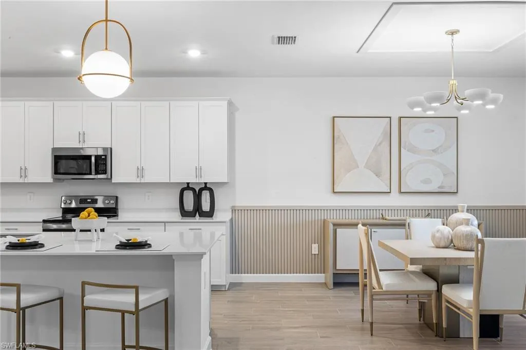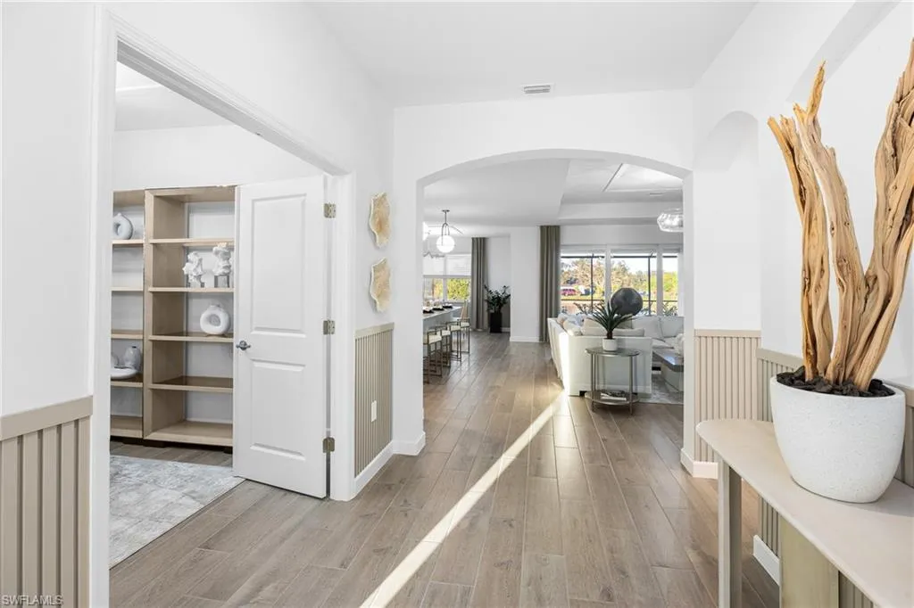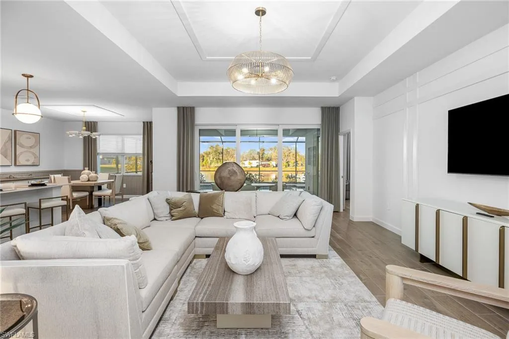 The open-concept layout includes a chef’s kitchen with white quartz countertops, stainless steel appliances, an oversized island, and seamless flow into the great room and out to the covered lanai—perfect for entertaining. Step outside to your private outdoor oasis featuring a custom pool and spa, paver pool deck, and beautiful lake views.
