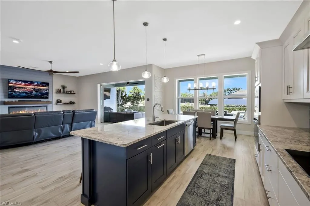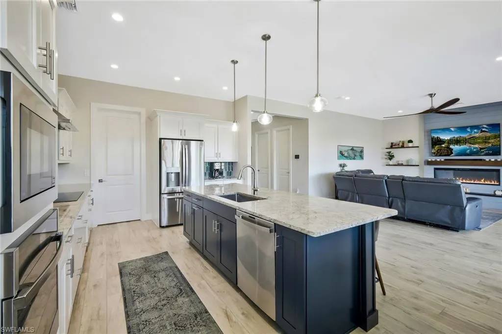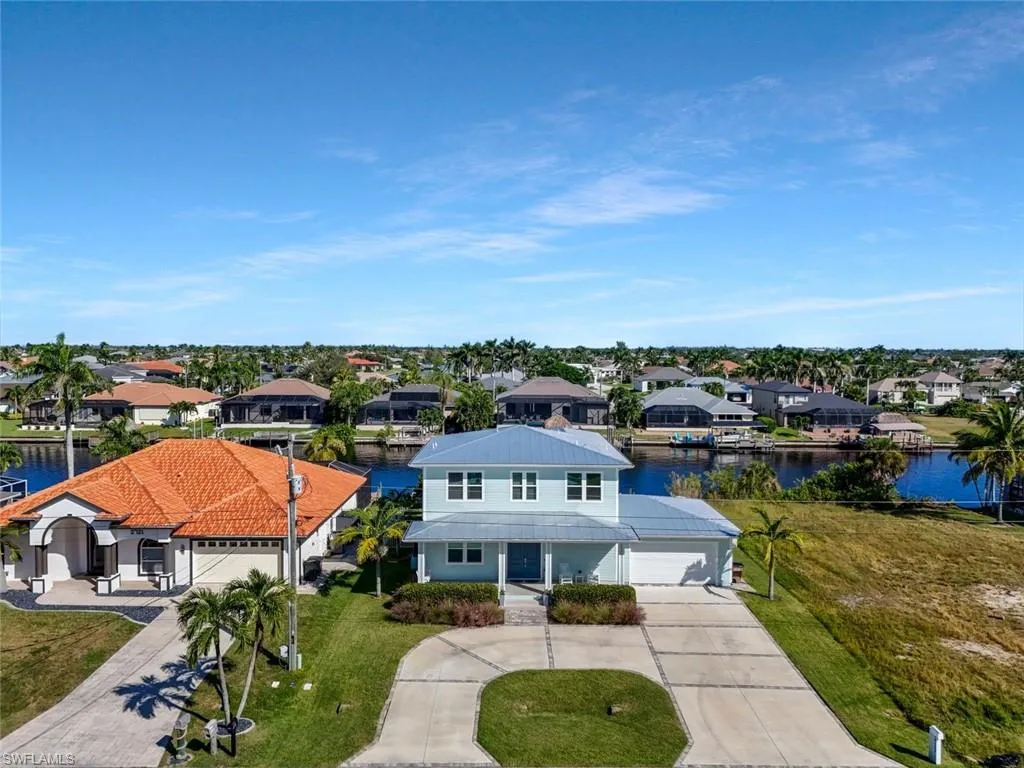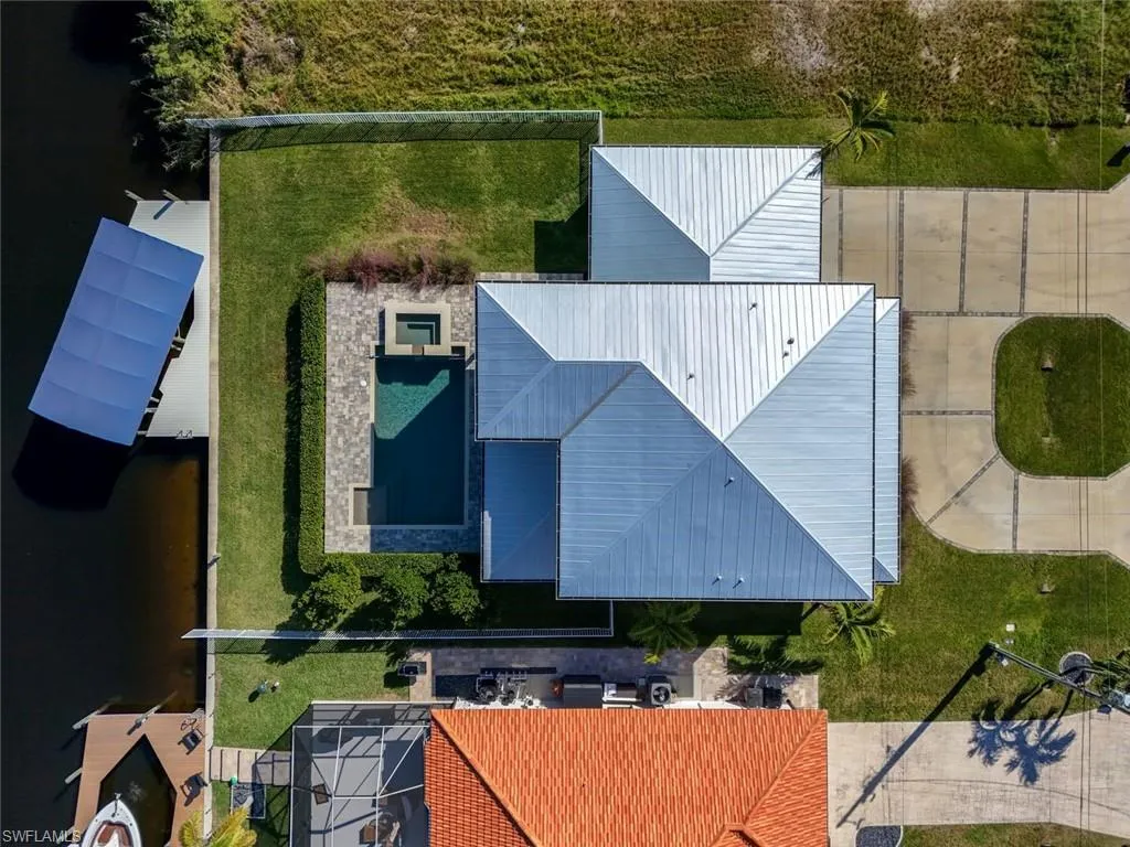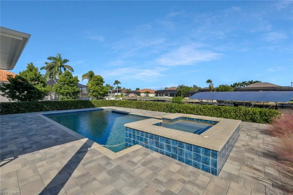 RELAXING POOLSIDE IN PARADISE! Discover luxury waterfront living in one of SW Cape Coral’s most desirable neighborhoods. This 2021-built Gulf access home offers 4 bedrooms, 3.5 baths, and 2,672 sq ft under air — blending quality construction with elegant, modern design. The open great room seamlessly connects to the spacious lanai, creating the perfect setup for entertaining or relaxing while enjoying spectacular sunsets. 12 feet of pocket sliders open wide to let the outdoors in. Outdoors, enjoy the best of the Florida lifestyle with a concrete set paver pool deck, saltwater pool and spa, and a spacious lanai perfect for hosting friends and family. There’s even an outdoor bathroom for poolside convenience. The large rear yard provides plenty of room for kids and pets to play, while the decorative aluminum fencing adds style and privacy. An oversized garage includes a rear roll-up door for easy backyard and canal access. Boaters will love the extra-wide deep canal with one bridge to open water, plus a Trex dock with 7,000 lb. lift, canopy frame, captain’s walk, and electric & water hookups. Built for both style and strength — this home features stem wall construction, high impact resistant windows and doors, a standing seam metal roof, and sits 2.1 feet above the 100-year flood zone. Inside, enjoy smart appliances, real wood soft-close cabinetry, granite counters, luxury vinyl flooring, and a built-in electric fireplace. A monitored security system, walk-in pantry, and ample storage add everyday convenience. Located in a quiet, established area close to top-rated schools, Sands Park, shopping, dining, and Cape Harbour Marina. Whether you’re looking for a full-time residence, seasonal getaway, or high-performing vacation rental, this home checks every box.