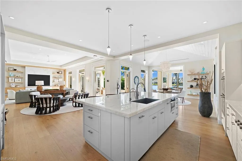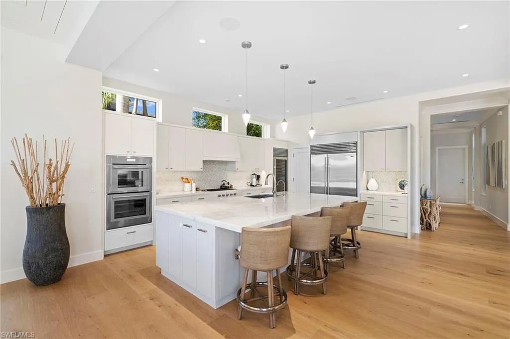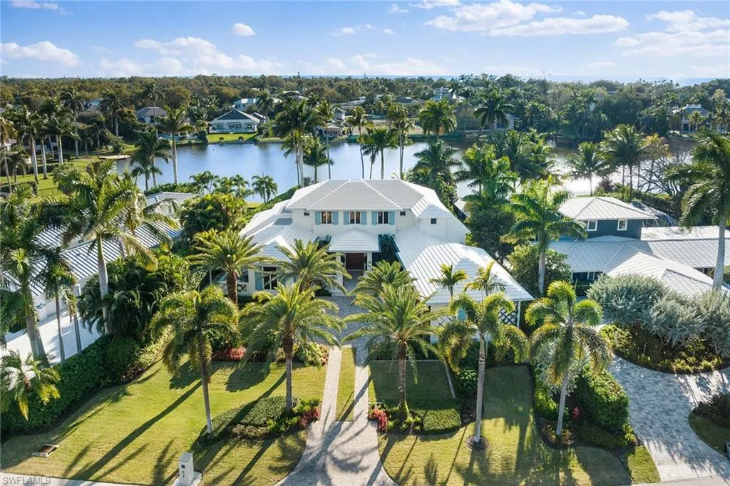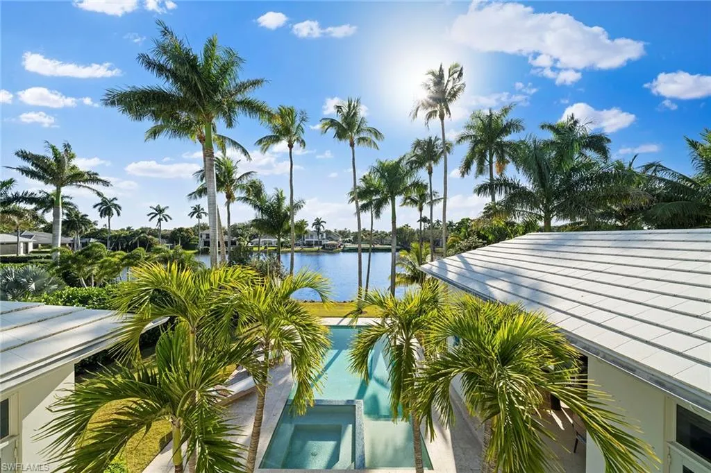 Located in the highly desirable Palm Circle neighborhood, this beautiful home designed by Kukk Architecture is a short four-block distance to the beach. With wide water, western lake views, this residence features spacious open living areas and a large gourmet kitchen. The home has five bedrooms and five baths, plus powder and pool bath and is 5,168 square feet under air and 7,033 square feet under roof. Additional features include an Artcraft designed kitchen with a Cristallo quartzite large center island, Wolf and Sub-Zero appliances, custom designed Legno Bastone wide-plank French oak wood flooring, upgraded plumbing fixtures, custom-built cabinets, lighting and millwork. Exterior features include a large outdoor living area, electric rolldown screens and shutters, outdoor kitchen, Philippine shell-stone deck, mahogany garage doors and mahogany front door. Construction consists of concrete block on both levels, a full-home generator, home automation, and impact doors and windows for storm protection. Enjoy breathtaking Naples sunsets while sitting at the picturesque pool area, overlooking South Lake. This one-of-a-kind property provides the ideal resort-style experience in the heart of Old Naples with proximity to 5th Avenue South and Third Street South.