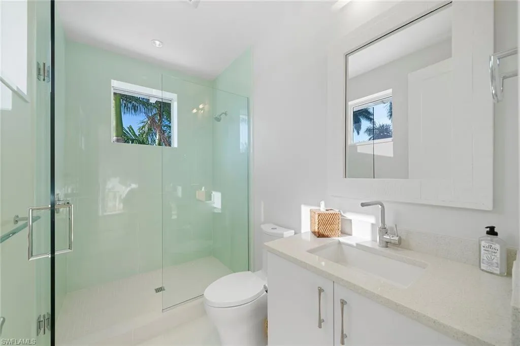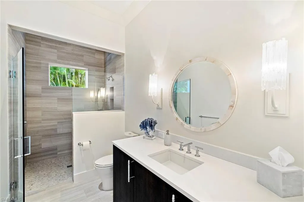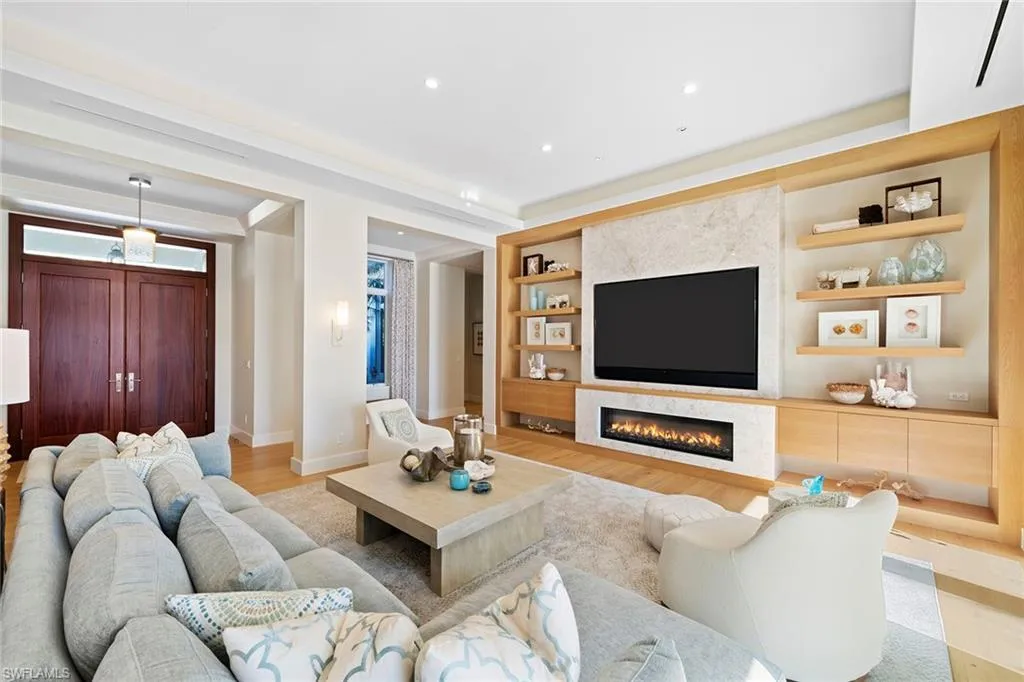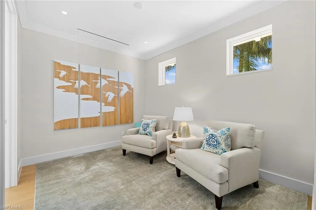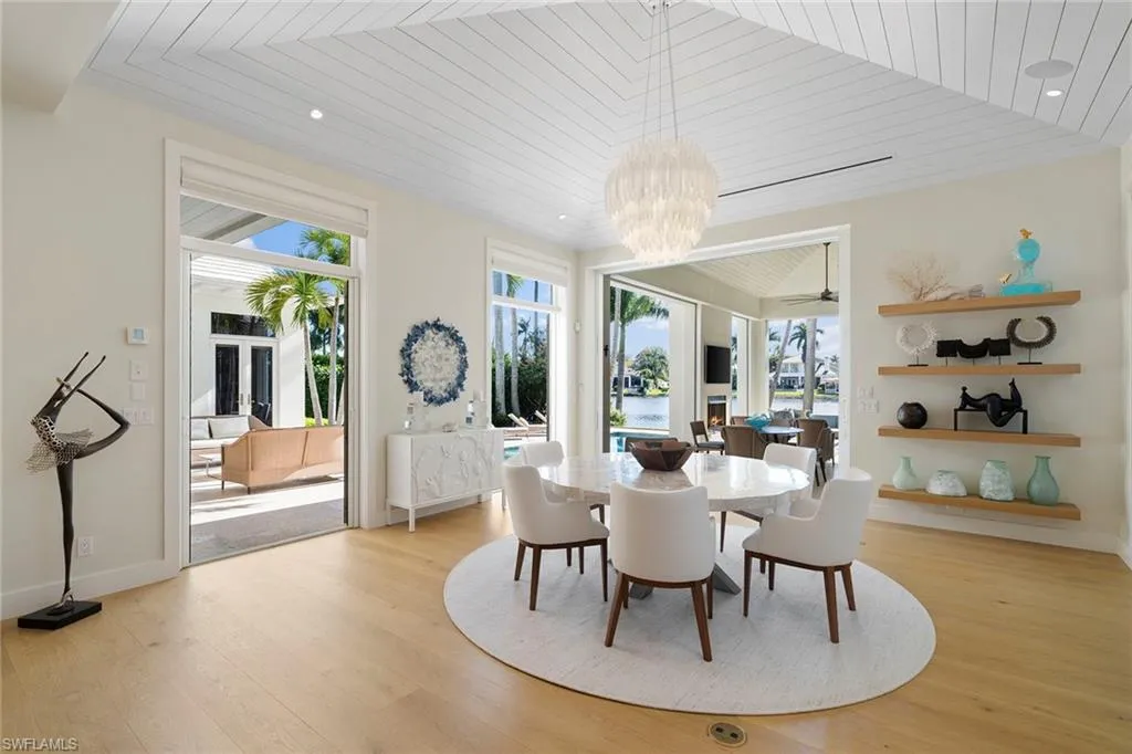 Located in the highly desirable Palm Circle neighborhood, this beautiful home designed by Kukk Architecture is a short four-block distance to the beach. With wide water, western lake views, this residence features spacious open living areas and a large gourmet kitchen. The home has five bedrooms and five baths, plus powder and pool bath and is 5,168 square feet under air and 7,033 square feet under roof. Additional features include an Artcraft designed kitchen with a Cristallo quartzite large center island, Wolf and Sub-Zero appliances, custom designed Legno Bastone wide-plank French oak wood flooring, upgraded plumbing fixtures, custom-built cabinets, lighting and millwork. Exterior features include a large outdoor living area, electric rolldown screens and shutters, outdoor kitchen, Philippine shell-stone deck, mahogany garage doors and mahogany front door. Construction consists of concrete block on both levels, a full-home generator, home automation, and impact doors and windows for storm protection. Enjoy breathtaking Naples sunsets while sitting at the picturesque pool area, overlooking South Lake. This one-of-a-kind property provides the ideal resort-style experience in the heart of Old Naples with proximity to 5th Avenue South and Third Street South.