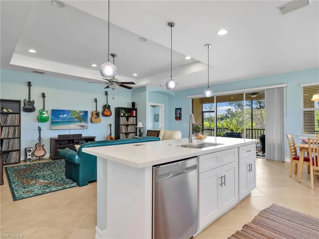Nestled on a lush corner lot in the gated Banyan Bay community in Fort Myers, this 3 bedroom, 2 bathroom home offers relaxed Florida living just 8 miles from Fort Myers Beach. Spanning 1,998 square feet, the open-concept design features a split bedroom layout and a bright great room with a tray ceiling and abundant natural light that flows seamlessly into the dining area and open kitchen. The kitchen showcases white shaker cabinetry, quartz countertops, a large island with pendant lighting, a walk-in pantry, and newer GE stainless steel appliances (2023). The private primary suite includes a tray ceiling, spacious walk-in closet, and a beautifully updated ensuite bathroom with quartz countertops, dual sinks, a makeup area, white shaker cabinetry, a curbless walk in shower, and a separate soaking tub. A French-door den provides the perfect space for a home office or hobby room, while the second bathroom offers modern finishes with a quartz countertop, white shaker cabinetry, and a tub-shower combination with a glass enclosure. Tile flooring extends throughout the main living areas, complemented by plush carpeting in the bedrooms. Enjoy the outdoors on the private screened lanai with paver flooring overlooking the landscaped backyard—ideal for birdwatching—with direct access to the yard through a screened door. Additional highlights include a transom and sidelight window at the front entry, a laundry room with a utility sink, garage cabinets, and newer AC and water heater (2023). Set on a rare corner lot with no neighbor on one side, this home offers an expansive side yard for added privacy and outdoor enjoyment. Located in Banyan Bay, a quaint gated community of just 132 residences along the Winkler Corridor featuring three tranquil lakes and a community pool. NO CDD or Fort Myers city tax! With low HOA fees covering lawn care and irrigation, you’ll have more time to relax and enjoy the Southwest Florida lifestyle—just minutes from shopping, dining, Health Park Hospital, and the Gulf beaches of Fort Myers, Sanibel, and Captiva islands!