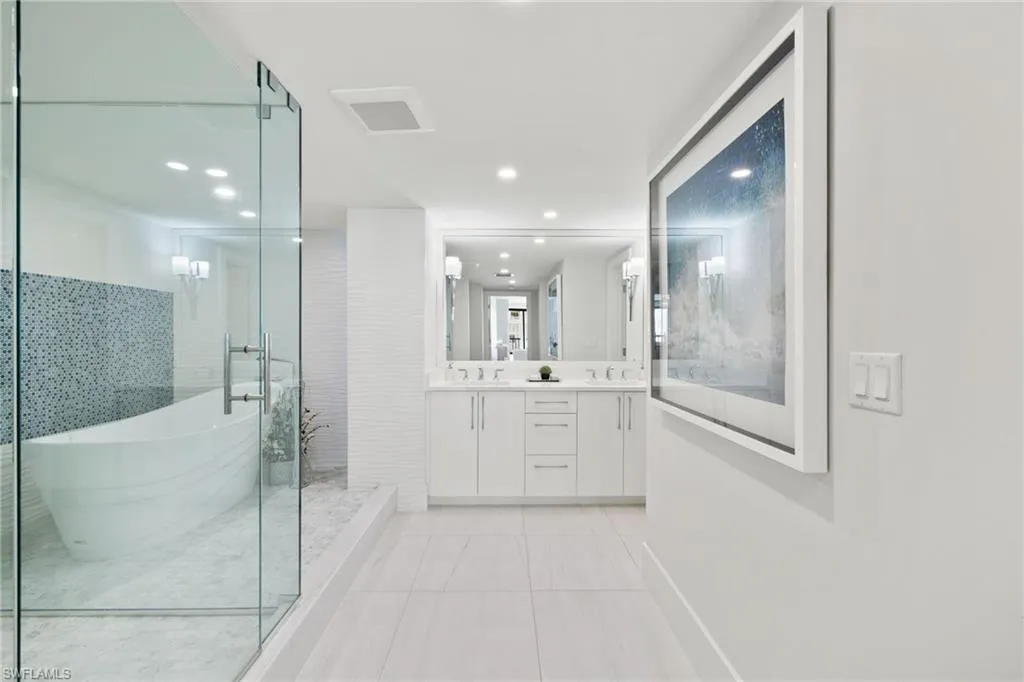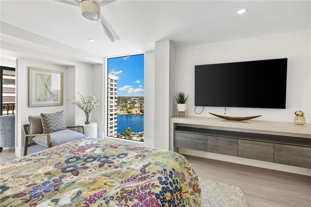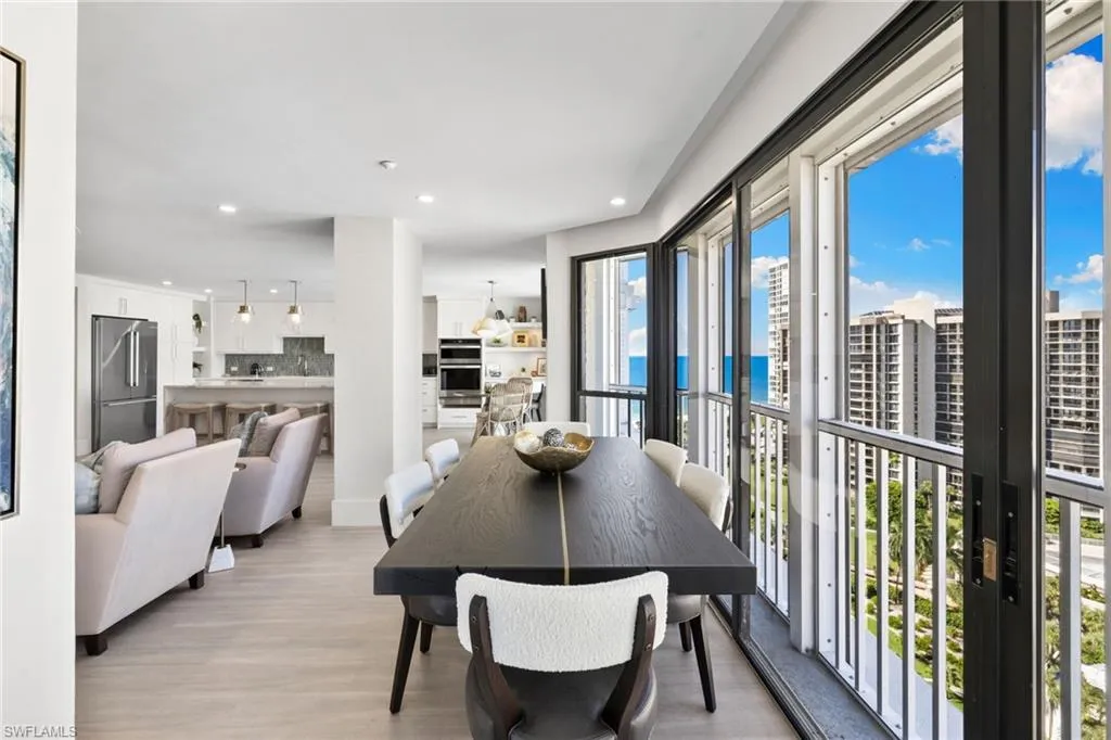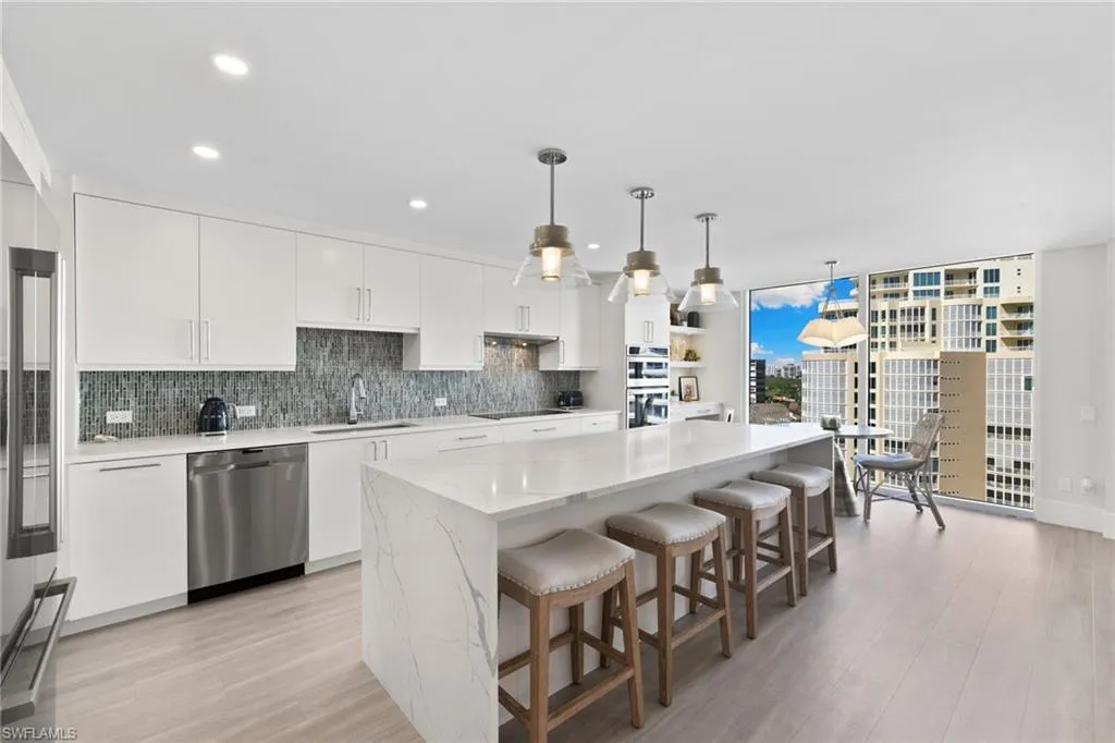 16th-floor end residence at Monaco Beach Club with panoramic views of Venetian Bay and the Gulf. This updated 3 bedroom 2 bath home delivers light-filled living with walls of glass, an open great room, and a window-wrapped dining and sitting area. The coastal kitchen features a long entertainer’s island, sleek white cabinetry, a mosaic backsplash, and upgraded appliances. The serene primary suite includes a window-lined reading/lounge nook with sweeping 16th-floor vistas, plus a spa bath with dual sinks, a frameless glass shower, and a soaking tub. Two guest bedrooms enjoy big-sky views and excellent privacy. Stylish furnishings create an effortless, move-in-ready experience. Monaco Beach Club is a Gulf-front tower in Park Shore with direct beach access and an easy stroll to Venetian Village. Amenities include a beachfront pool/spa, fitness center, updated social rooms, grilling/picnic areas, library, on-site management with 24-hour lobby staff/security, and access to the Park Shore beach promenade. Refined coastal living from sunrise to sunset.