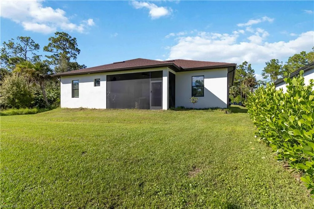 Welcome to your private oasis, where comfort meets elegance. Newer construction built in 2022. This home features an OPEN FLOOR CONCEPT, 3 bedrooms +Den, possible 4th bedroom, 2-bathroom, LARGE ISLAND with granite countertops, COMTEMPORY WHITE CUSTOM CABINETRY, PANTRY, stainless steel appliances, tile floor, water softener with reverse osmosis system under kitchen sink and 2 car garage. A screened in Lanai to entertained guest. CUSTOM LIGHTING and 8FT INTERIOR DOORS. This property is just minutes from the beach, and fine dining downtown Naples. Golden gates estate is growing with shopping plaza and Publix just 4-miles away. Perfect for those seeking a tranquil lifestyle with no HOA. This modern single family home sits on 1.14-acre lot.