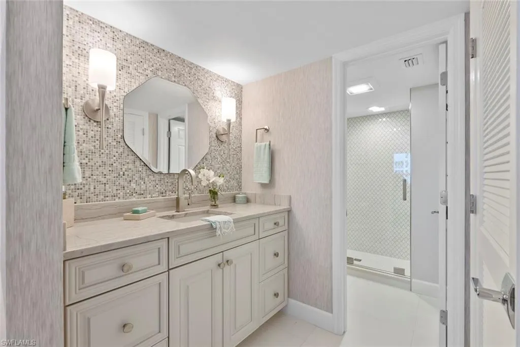 This stunning 2 Bedroom + Den beachfront condo in the coveted Park Shore – Venetian Village area offers luxury and sophistication and has been completed renovated to include only the finest finishes. The thoughtfully designed great room floor plan includes a gourmet chef’s kitchen, 2 spacious lanais, motorized blinds, custom closets and built ins, impact glass and doors throughout, spectacular views of the Gulf of America and Venetian Bay, and more. The primary suite is a tranquil oasis with a private balcony overlooking the Gulf and an opulent bathroom. The guest suite offers a comfortable and private space with bath ensuite, an enormous walk in closet, and ample storage and the den allows for privacy, stunning Gulf views, bath ensuite, and can easily be transformed into a third bedroom. New AC, new laundry appliances, freshly painted, new electric shades and beautiful furnishings make this the ideal unit to move right in and begin enjoying your luxury beachfront condo! Park Shore Tower is a special building nestled in the Park Shore area which includes a 24 hour attendant, fitness center, resort pool/spa just steps from the beach, grilling stations, fire pit, a newly renovated clubhouse with full kitchen for entertaining, and a two bedroom guest suite.