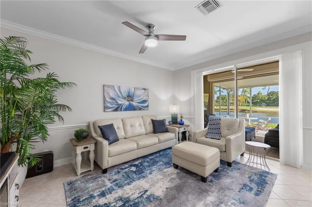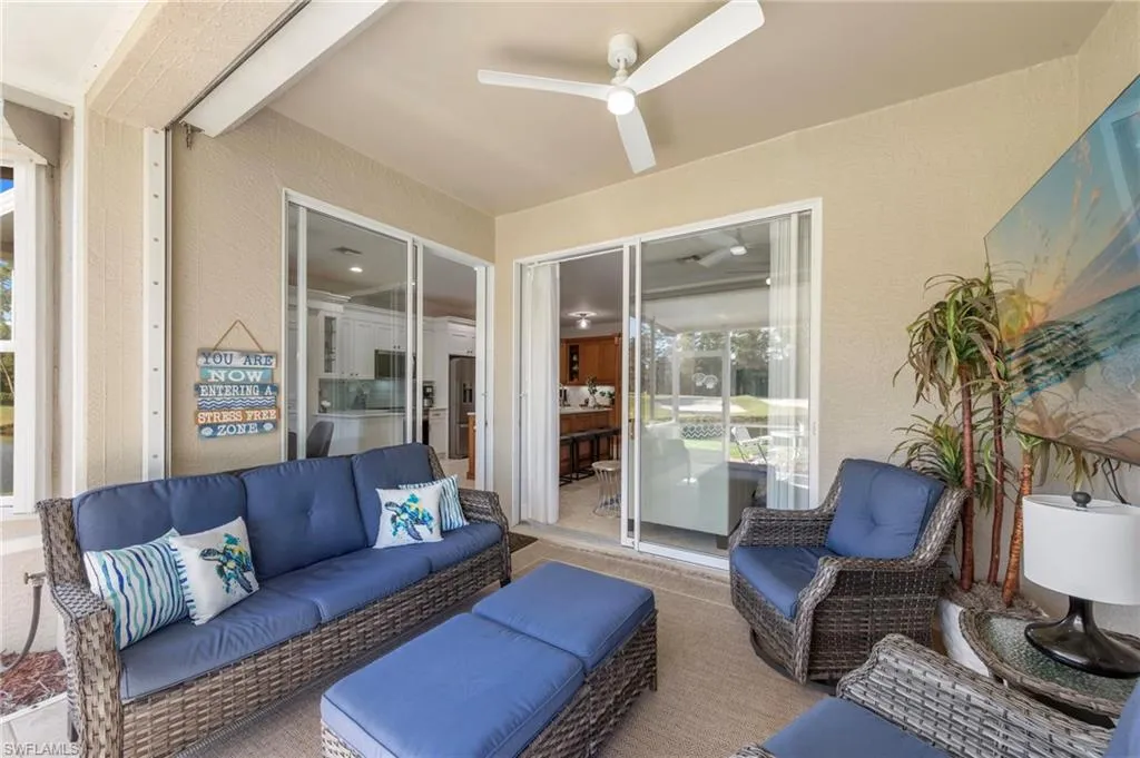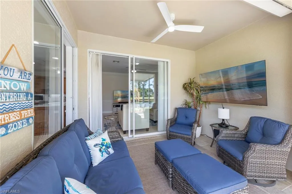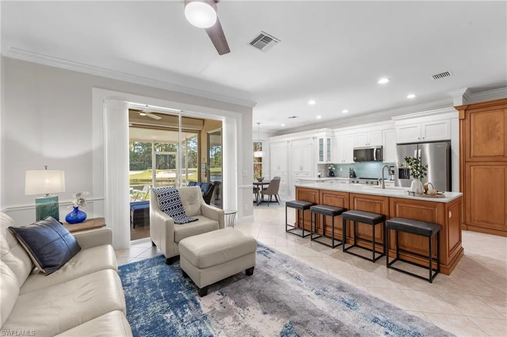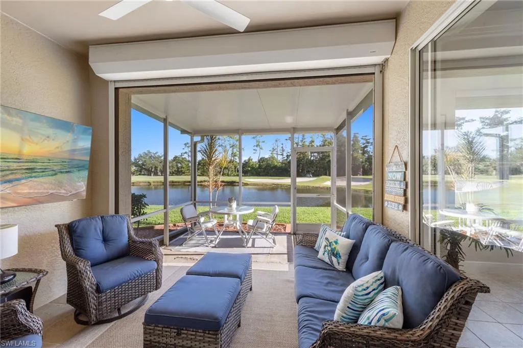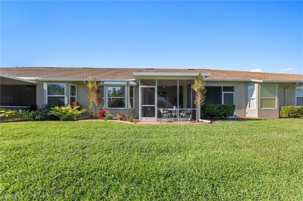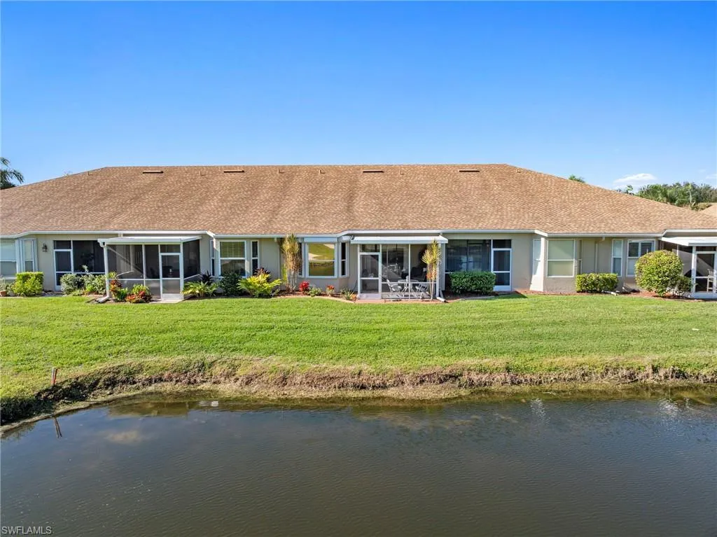 Immaculate Lakefront Villa with Stunning Views and Custom Upgrades Throughout! This beautifully maintained 2 bedroom, 2 bath villa offers a spacious great room floor plan designed for comfort, entertaining, and capturing the gorgeous lake, golf course, and preserve views. The open layout is highlighted by tile flooring throughout the main living areas, neutral finishes, and abundant natural light. The chef’s kitchen is a true centerpiece, featuring granite countertops, a large island perfect for entertaining, a stylish glass backsplash, and custom cabinetry with soft-close doors, drawers, and pull-out shelving for maximum storage. The built-in desk with matching cabinetry adds both beauty and functionality. Whirlpool stainless steel appliances include a French door refrigerator with pull-out freezer, WiFi-enabled range, and large-capacity dishwasher. The spacious primary suite offers a walk-in closet with custom built-ins, and an updated ensuite shower, featuring an upgraded vanity, countertop, and modern glass shower door. The guest bedroom and bath are equally inviting, ideal for family or visitors. Step outside to the covered and extended lanai and enjoy the serene setting overlooking the lake and golf course — perfect for morning coffee or evening relaxation. Additional features include Trane 2-stage A/C unit with Smart thermostat (2023), New water heater (2025), Epoxy-coated garage floor (2025), Updated lighting and recessed fixtures, Electric hurricane shutters on front, rear, and bay window, Electric roll-down blinds on the bay window. This immaculate villa combines quality construction, tasteful updates, and a premium waterfront location. Move-in ready and loaded with thoughtful details, it’s the perfect place to call home!Stoneybrook amenities offer something for everyone! Enjoy access to an exercise room, 3 community pools, tennis courts, pickleball, volleyball, basketball, bocce ball, a playground, and even a baseball field. The public golf course means you can pay as you play—no membership required. Conveniently located near shopping, dining, I-75, FGCU, beaches, and RSW airport. You’re just a short walk to the golf clubhouse, CVS, Publix, Miromar Outlets, and Hertz Arena. With low association fees and a full range of amenities, it’s easy to see why Stoneybrook remains one of Estero’s most popular communities.