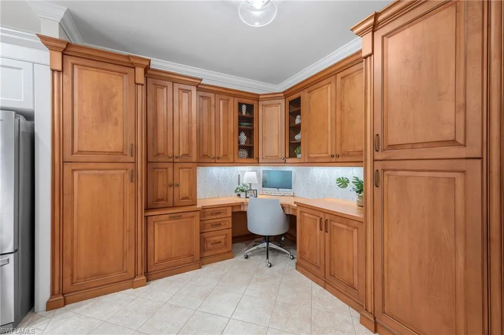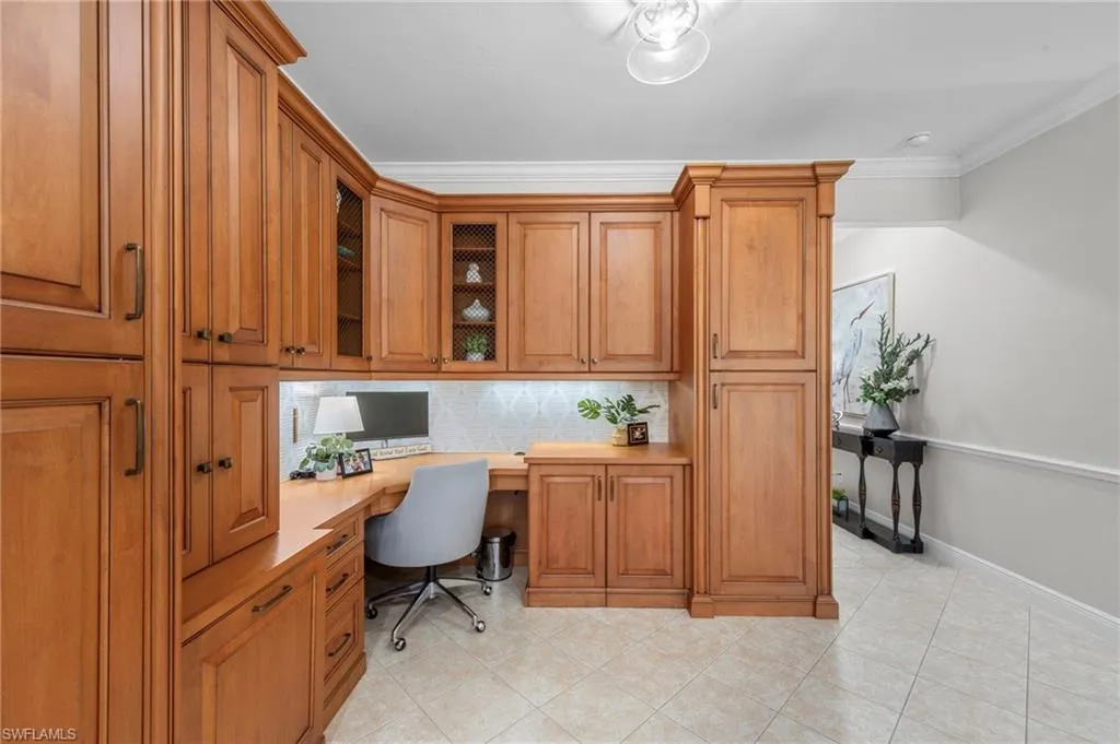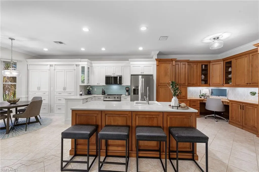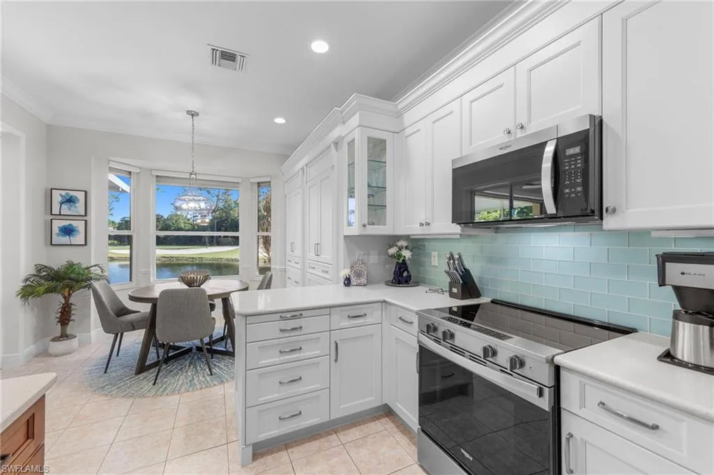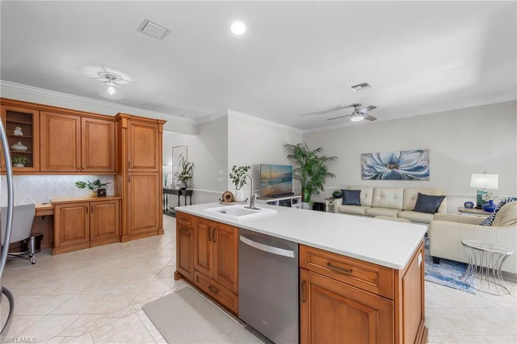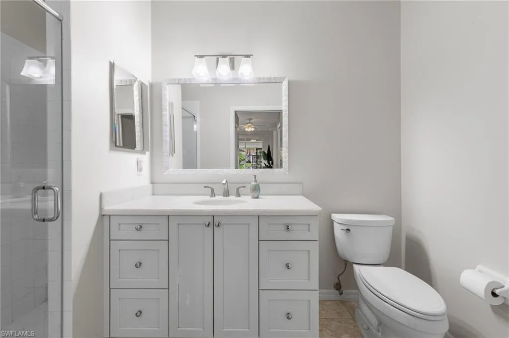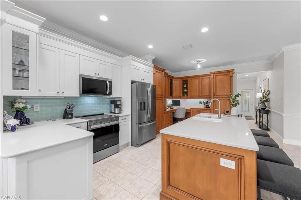 Immaculate Lakefront Villa with Stunning Views and Custom Upgrades Throughout! This beautifully maintained 2 bedroom, 2 bath villa offers a spacious great room floor plan designed for comfort, entertaining, and capturing the gorgeous lake, golf course, and preserve views. The open layout is highlighted by tile flooring throughout the main living areas, neutral finishes, and abundant natural light. The chef’s kitchen is a true centerpiece, featuring granite countertops, a large island perfect for entertaining, a stylish glass backsplash, and custom cabinetry with soft-close doors, drawers, and pull-out shelving for maximum storage. The built-in desk with matching cabinetry adds both beauty and functionality. Whirlpool stainless steel appliances include a French door refrigerator with pull-out freezer, WiFi-enabled range, and large-capacity dishwasher. The spacious primary suite offers a walk-in closet with custom built-ins, and an updated ensuite shower, featuring an upgraded vanity, countertop, and modern glass shower door. The guest bedroom and bath are equally inviting, ideal for family or visitors. Step outside to the covered and extended lanai and enjoy the serene setting overlooking the lake and golf course — perfect for morning coffee or evening relaxation. Additional features include Trane 2-stage A/C unit with Smart thermostat (2023), New water heater (2025), Epoxy-coated garage floor (2025), Updated lighting and recessed fixtures, Electric hurricane shutters on front, rear, and bay window, Electric roll-down blinds on the bay window. This immaculate villa combines quality construction, tasteful updates, and a premium waterfront location. Move-in ready and loaded with thoughtful details, it’s the perfect place to call home!Stoneybrook amenities offer something for everyone! Enjoy access to an exercise room, 3 community pools, tennis courts, pickleball, volleyball, basketball, bocce ball, a playground, and even a baseball field. The public golf course means you can pay as you play—no membership required. Conveniently located near shopping, dining, I-75, FGCU, beaches, and RSW airport. You’re just a short walk to the golf clubhouse, CVS, Publix, Miromar Outlets, and Hertz Arena. With low association fees and a full range of amenities, it’s easy to see why Stoneybrook remains one of Estero’s most popular communities.