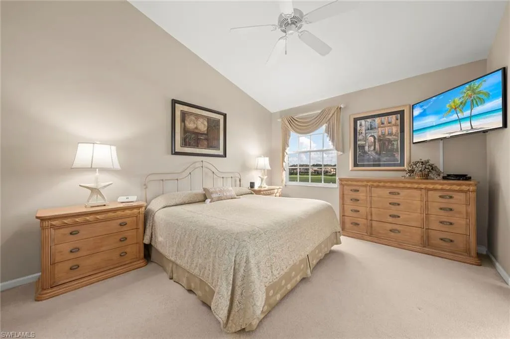 Enjoy tranquil eastern-facing views of the golf course and lake from this turnkey furnished end residence in Shadow Wood at The Brooks. Designed with soaring ceilings and abundant natural light, the home also offers opportunities for bird watching and quiet reflection. Recent upgrades include a newer air-conditioning system, a tankless water heater, a washer and dryer, and a durable tile roof installed in 2021. A fresh exterior paint scheme with updated lighting and gutters enhances the residence’s curb appeal. The kitchen reflects a light and bright aesthetic with white cabinetry and Corian countertops. The spacious primary suite features expansive lake and golf views, a large walk-in closet, and a spa-style bath with a tiled shower, soaking tub, dual sinks and dedicated vanity. The oversized front guest bedroom includes a built-in desk and custom wall unit, offering flexibility as a sleeping space or home office. A third bedroom with twin-set beds is near the guest bath, which includes a custom vanity and designer accents. The screened lanai is the ideal place for morning coffee or alfresco dining with panoramic nature views. Additional features include electric storm shutters and two bicycles for enjoying the community’s miles of walking and biking trails. Shadow Wood spans 1,500 acres east of U.S. 41 and offers 54 holes of championship golf, nine tennis courts and three bocce courts with optional memberships. A new lifestyle center is underway, which will feature a resort-style pool, poolside dining and six indoor pickleball courts.