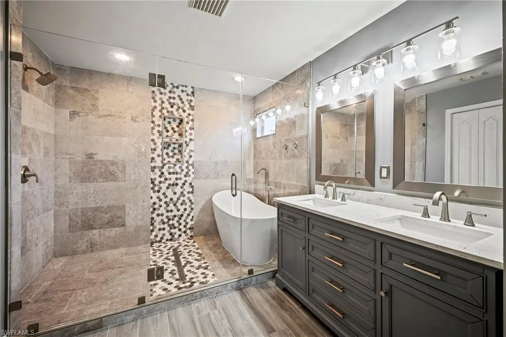 This beautifully updated 4-bedroom, 3-bath home offers the perfect blend of comfort, function, and style. The upgraded kitchen features modern finishes and opens to a bright, spacious living area with new plank tile flooring on the first floor and matching luxury vinyl plank upstairs. A first-floor bedroom and full bath make an ideal space for guests or a home office. Upstairs, the primary suite impresses with a luxurious soaking tub, oversized walk-in shower, and custom closet storage. Step outside to your private backyard retreat—an extended paver lanai with a covered entertaining space and sparkling pool. The expanded paver driveway accommodates three cars with ease. The roof was replaced in 2021 and the AC was replaced in 2022.