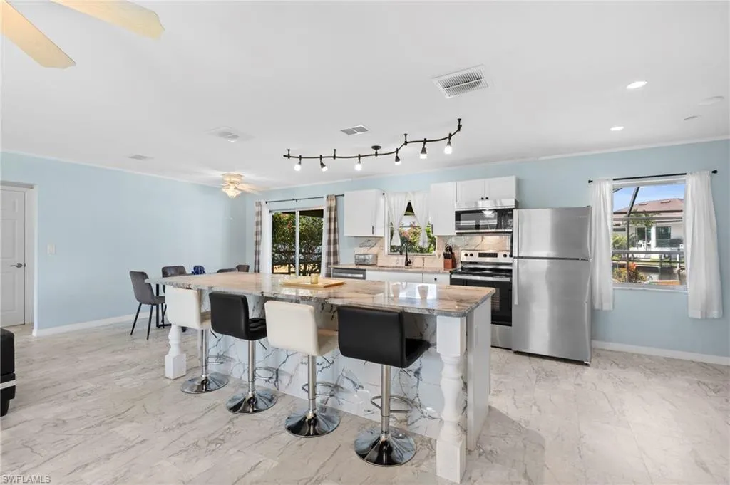 BRING AN OFFER- DIRECT GULF ACCESS-OVERSIZED CORNER LOT- QUICK BOAT RIDE TO THE GULF! Discover your perfect waterfront retreat with this beautifully upgraded Gulf access home located on an oversized lot in Cape Coral. Enjoy direct sailboat access with no bridges, just a 10-minute boat ride to the river and 20 minutes to Fort Myers Beach. Step outside to your own private oasis featuring a screened-in heated saltwater pool, a brand-new composite deck, and a 10,000-pound boat lift—perfect for exploring Southwest Florida’s waterways. The exterior also features lush redone landscaping, a full irrigation system, and a highly elevated lot offering peace of mind and enhanced curb appeal. Inside, the open floor plan is filled with natural light and upgraded flooring throughout. The fully remodeled kitchen is ideal for entertaining, showcasing soft-close cabinetry, stainless steel appliances, and an impressive 12-foot granite island. The spacious master suite includes an oversized walk-in closet and a beautifully updated bathroom with a walk-in shower and dual quartz vanities. The guest bedroom is generously sized, and the second bathroom has also been tastefully upgraded. Additional highlights include a deep garage that easily fits two cars, a new washer and dryer with laundry tub, a new roof, new pool heater, and city water and sewer in place. There are no rental restrictions, making this an excellent option for full-time residents, first time home buyers, seasonal living, or investment. A 2006 Cobia brand boat can be negotiated with a strong offer. Ideally located in the heart of Cape Coral near shopping, dining, and entertainment, this move-in ready Gulf access home truly has it all.