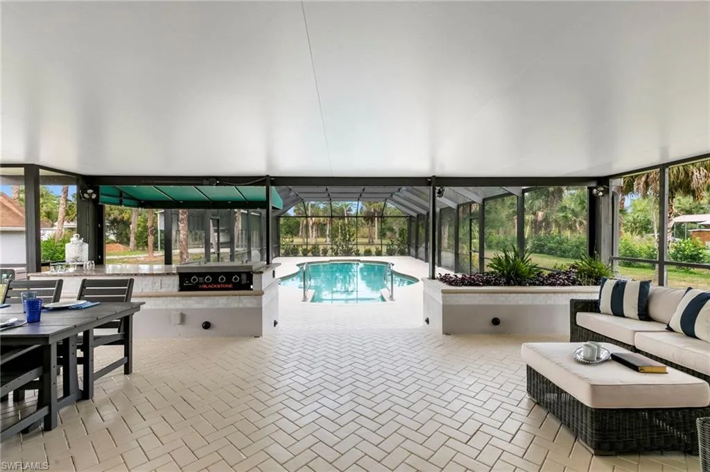 Two sets of double sliders lead to nearly 2,000 square feet of screened outdoor living space, complete with a sparkling pool and plenty of room to entertain.