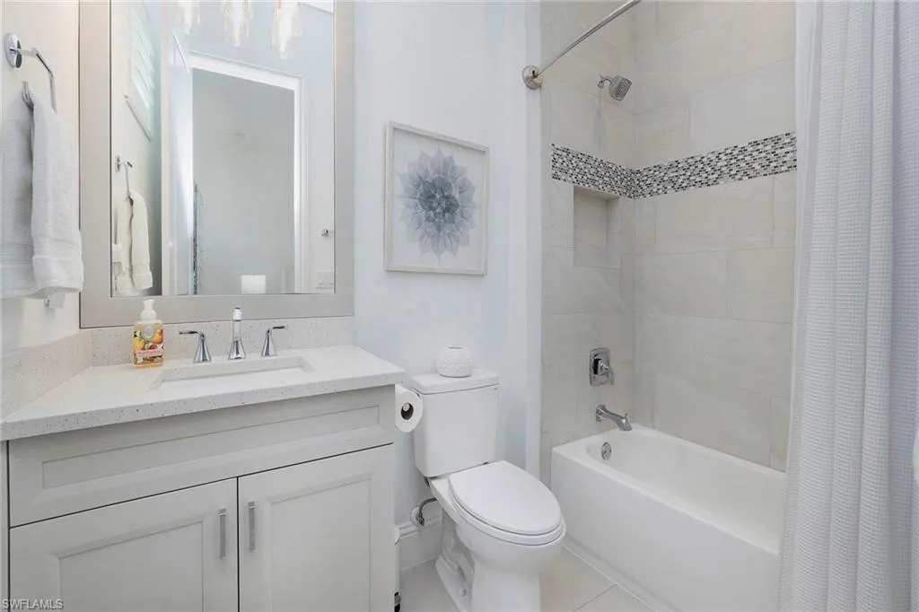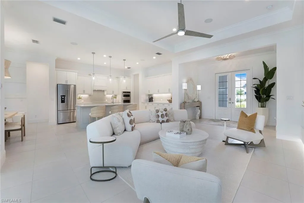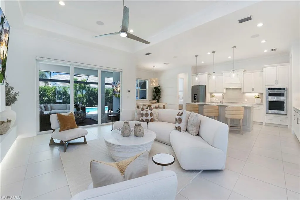 This stunning Stock Development-built 3 Bed + Den Siesta III residence captures the essence of refined coastal living with elegant finishes, thoughtful upgrades, and serene indoor-outdoor flow. Perfectly situated within the prestigious Crane Point neighborhood of Naples Reserve, this home blends architectural excellence with a contemporary sense of comfort. Upon entry, volume ceilings, abundant natural light, and new interior and exterior paint create a bright and inviting ambiance. The open-concept great room features a custom feature wall that becomes the visual centerpiece of the space, while designer lighting, new fans, and Hunter Douglas window treatments enhance both style and functionality. The gourmet kitchen caters to the culinary enthusiast with premium cabinetry, quartz surfaces, an induction cooktop, and a spacious island that invites gathering and conversation. Every detail reflects intentional design, from the seamless integration of a SONOS whole-home sound system to the impact glass windows and doors that bring peace of mind and quiet luxury. The primary suite offers a tranquil retreat, with direct access to the lanai and a spa-inspired bath that includes dual vanities, a floating soaking tub, a separate glass-enclosed shower, and a custom-designed closet system that maximizes organization and elegance. Designed for entertaining and relaxation alike, the outdoor living area extends the home?s living space with a heated saltwater pool and infinity-edge spa, complemented by an outdoor kitchen ideal for al fresco dining. Storm Smart electric roll-down screens create effortless comfort and protection, allowing year-round enjoyment of the Lanai’s private, resort-like setting. Additional highlights include a three-car garage with epoxy flooring, abundant storage, and pristine landscaping that enhances curb appeal. Located within Naples Reserve, residents enjoy a world of amenities, including pickleball and Har-Tru tennis courts, a cutting-edge fitness center, scenic walking and biking trails, and a 125-acre lake with kayaking, paddleboarding, and lakeside recreation. The renovated clubhouse and restaurant, anticipated for completion in 2026, will further elevate the community’s social and lifestyle offerings. This is more than a home it’s a lifestyle of comfort, sophistication, and connection, where every day feels like a vacation in paradise.