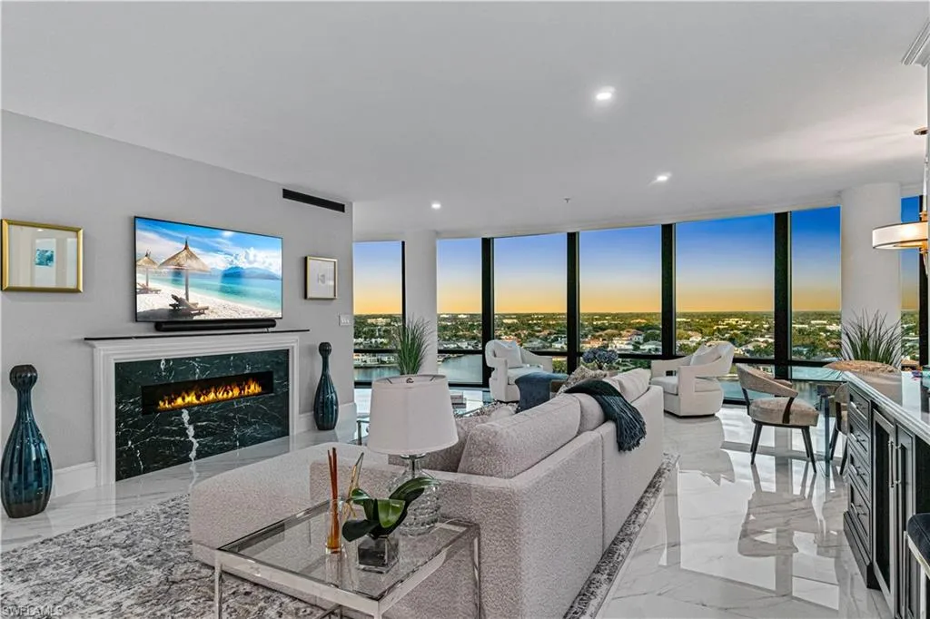 Positioned within Le Ciel Venetian Tower in prestigious Park Shore, this sophisticated residence showcases sweeping views of Venetian Bay, where mornings unfold in soft sunrise hues and evenings glow with the shimmer of city lights. Designed with elegance and intention, the two-bedroom plus den layout offers over 2,500 square feet and is furnished in refined luxury, featuring a comprehensive renovation distinguished by craftsmanship and attention to detail. The open kitchen centers around an impressive entertaining island, complemented by custom Conestoga cabinetry and state-of-the-art Miele appliances. Inalco tile flooring flows throughout, enhanced by designer lighting fixtures, a striking fireplace in the living room, custom window coverings, and impact-rated windows. The serene primary suite offers custom walk-in closets with dual wall safes and a spa-inspired bath, creating a retreat of comfort and style. Additional highlights include a whole-home water filtration system, one deeded parking space, and private storage. Residents of Le Ciel Venetian Tower enjoy gated entry, on-site management and security, a beachfront pool and spa, tennis courts, a fitness center with sauna and steam rooms, two guest suites, a social room, BBQ area, and direct beach access all just moments from The Village on Venetian Bay, the Park Shore Promenade, and the Venetian Bay Yacht Club.