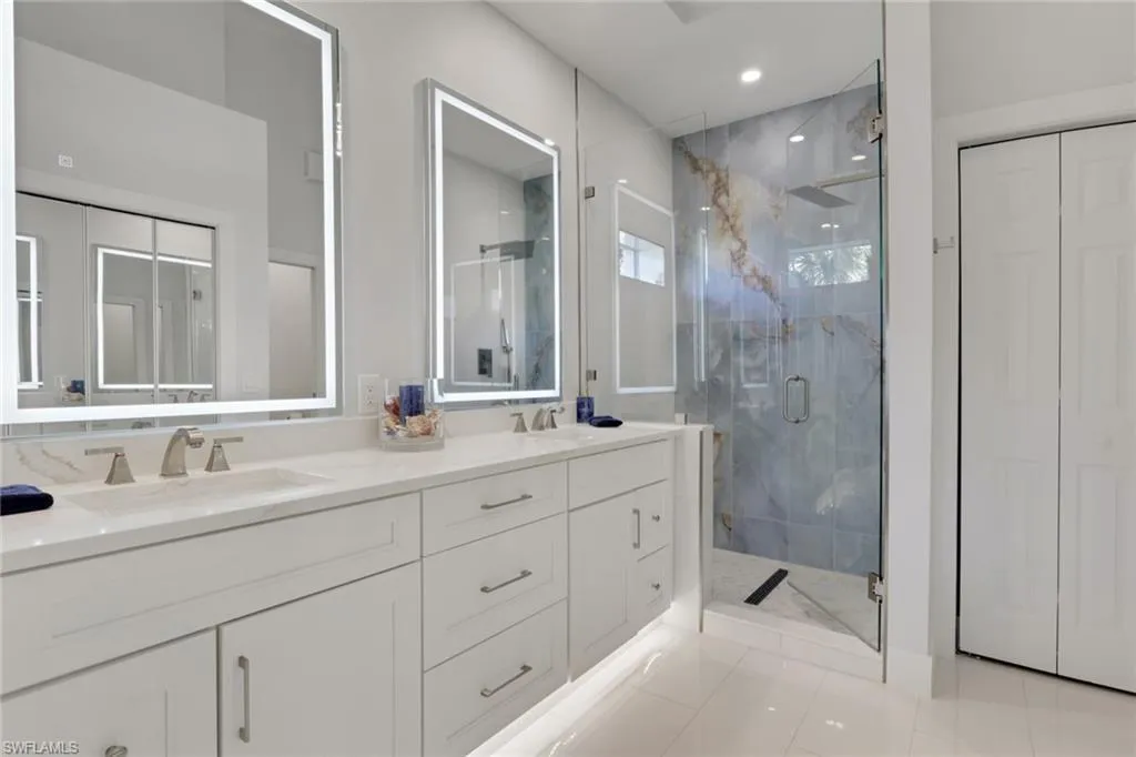 Discover this beautifully renovated & reimagined 3-bedroom, 2-bath condominium in Falling Waters featuring one of the largest saltwater pools in Naples. This modern end-unit residence includes a detached garage with custom cabinetry for additional storage and has been thoughtfully redesigned to balance functionality and elegance. The home showcases rich engineered wood flooring, crisp new baseboards, and detailed casement moldings that define each space with architectural precision. The reimagined kitchen offers expanded custom cabinetry, quartz waterfall countertops, pendant lighting, stunning new chandeliers, and GE Profile appliances, all designed for beauty and efficiency. Both bathrooms were completely redesigned with designer tile work, new toilets, dual quartz vanities, LED mirrors, and seamless glass shower doors. The primary suite is a true retreat, highlighted by ocean-inspired tile, a double-sink quartz vanity, new pocket doors, and sophisticated brushed-gold finishes. Natural light fills the living spaces, enhanced by new recessed lighting and direct-drive ceiling fans with integrated lights. Every closet has been upgraded with cedar shelving, and the entire interior has been freshly repainted. The lanai extends the home’s living space with upgraded lighting, an under-counter GE refrigerator, and a built-in BBQ, ready for relaxing or entertaining. Falling Waters offers an impressive array of amenities, including a sprawling saltwater lagoon-style pool surrounded by waterfalls and tropical landscaping, a beautifully updated clubhouse, tennis and bocce courts, putting green and a vibrant social calendar. The community’s lush setting and resort atmosphere create an unmatched Naples lifestyle experience. Falling Waters is ideally located just minutes from Downtown Naples, Tin City, and 5th Avenue South. Surrounded by new development and planned expansion, this area continues to grow in appeal and long-term value. Modern, functional, and ideally located—this is one of the finest residences in Falling Waters.