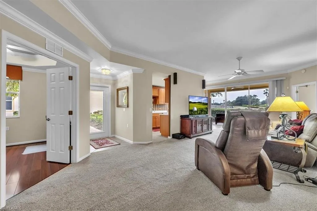 Great Opportunity to Own a First Floor Unit in the Gated Verandah Community in the Idlewild neighborhood. This exceptional coach home offers 1421 sq. ft. of living space and comes fully furnished. It boasts crown molding, a water softener for the entire condo, and has been freshly painted recently. With 2 bedrooms, a den, and 2 baths, this unit offers ample living space for residents. The panoramic super screened-in lanai features tile flooring and provides stunning views of hole #4 on the Jack Nicklaus designed golf course and a lake in the background. The two-car garage with epoxy floors adds convenience and luxury to the property. Upon entering the home, residents are greeted by a spacious family room and adjacent dining room with carpet and tile flooring. The kitchen is well-equipped with newer appliances, granite countertops, and plenty of cabinet space, including a nice pantry. The primary bedroom features a sleep number mattress, a large bathroom with dual sinks, a walk-in shower, and a large tub. The expansive den offers privacy with two French doors and is perfect for relaxation with leather recliners and wood flooring. The second bedroom and second bath provide ample space for guests or family members. Additional features of the home include a newer washer and dryer and AC unit. Residents can enjoy evening sunsets from the eastern exposure and spacious lanai while entertaining friends and family.