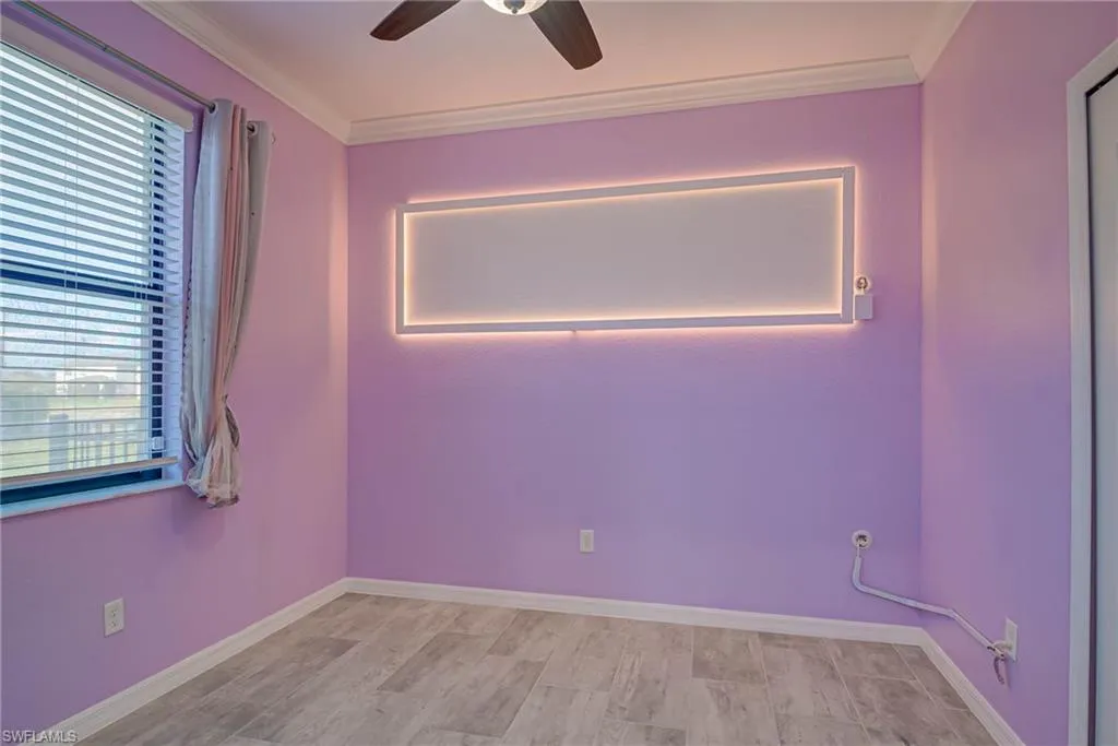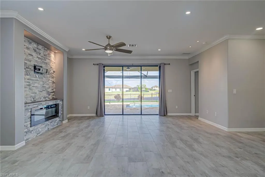 The living area includes a custom built-in media wall with an electric fireplace, creating a warm and inviting ambiance. Step outside to your private screened lanai where a heated pool awaits, perfect for relaxing or hosting friends while enjoying the tranquil water views.