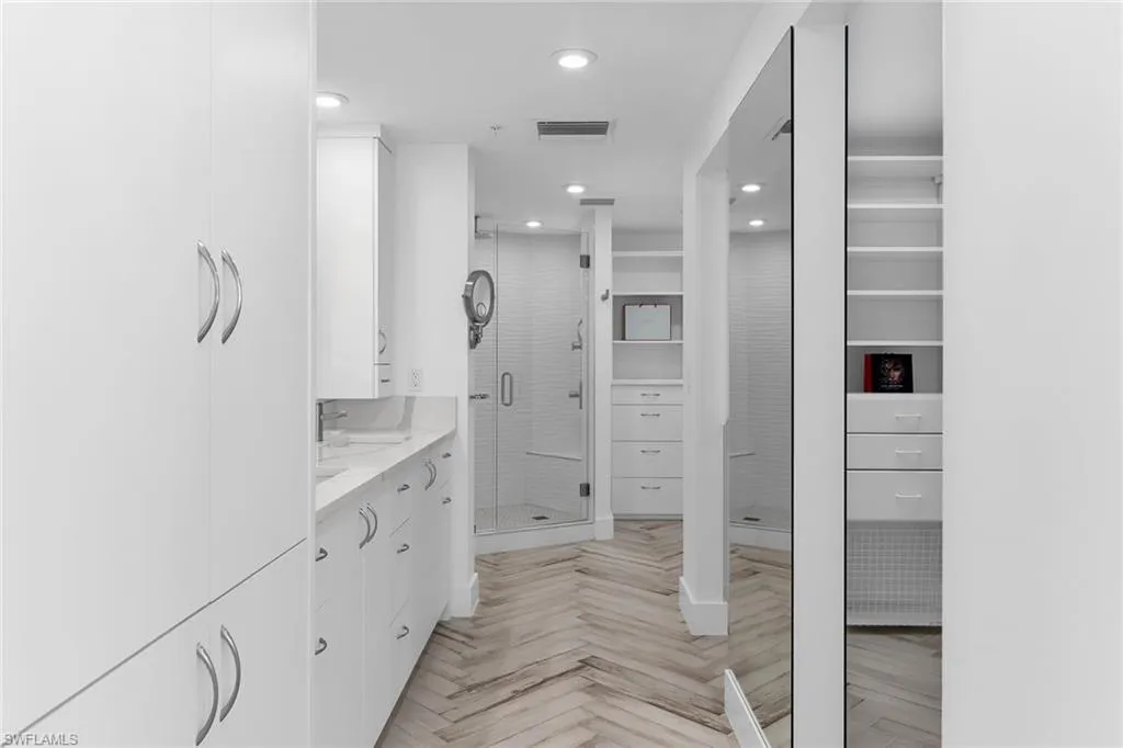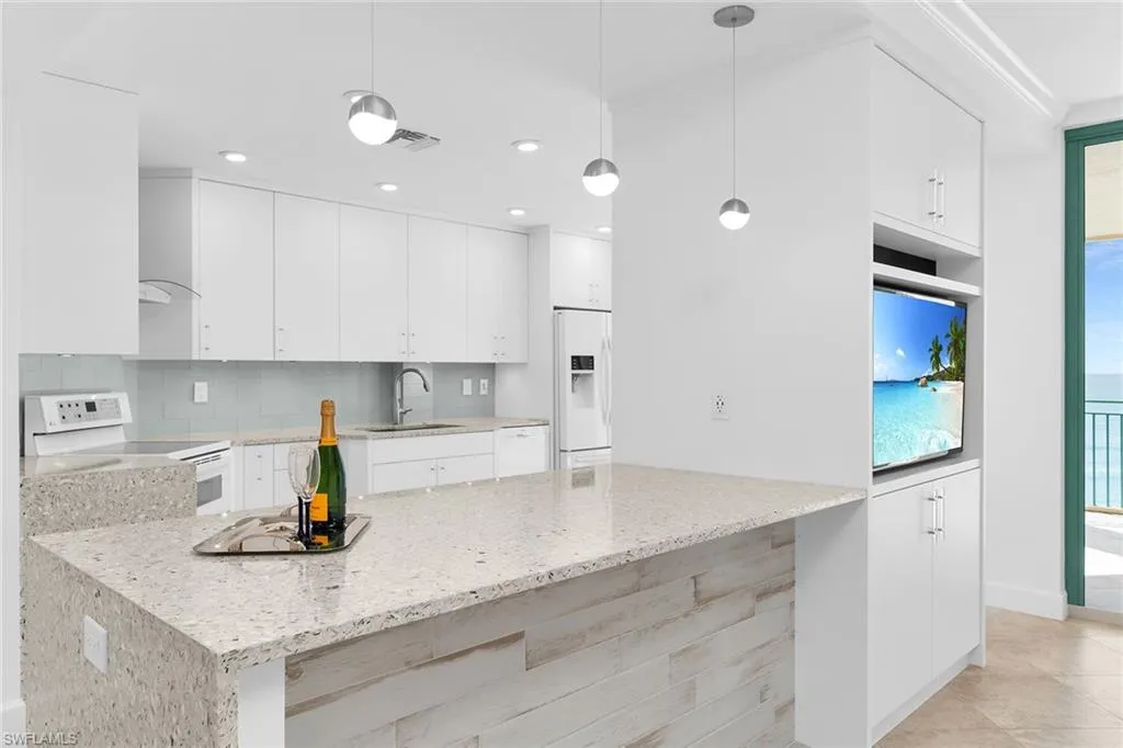Enjoy spectacular views of the Gulf of America and 10,000 Islands from the expansive terrace ideal for outside living and entertaining. Sit by the sea and relax, enjoy the boats, dolphins and manatee. Let the sea breezes and sounds of the gentle waves wash away the worries of the day. Wonderful recent renovations, transformed layout, quality craftmanship and elevated aesthetics combine to create a space that is beautiful and functional. Soaring 9-foot ceilings with full height glass maximize views of the azure waters. Key elements include seamless indoor/outdoor transitions with superb craftmanship throughout. Open kitchen offers water views, Vetrazzo countertops, breakfast bar, wine cooler/beverage center, custom cabinetry, soft-close drawers, ample storage and more. The luxurious primary suite affords Gulf views. Upscale primary bath features custom cabinetry, dual Pompei quartz vanity, lighted mirror, indulgent shower with multiple shower heads, generous walk-in closet with custom built-ins to accommodate your entire wardrobe. Privately located guest bedroom plus den/third bedroom provides ample space for visiting family and friends. Quality custom built in the guest bedroom for the convenience of your special guests, and den/bedroom affords built-in desk and queen Murphy bed. Every detail of the upgraded well designed laundry room creates an efficient use of space to simplify the laundry task and provide ample storage. Plantation shutters, Lutron lighting, crown moldings, solid core doors, built in safe and full storm protection further complement this wonderful residence. Offered unfurnished & ready for the pleasure of personalizing the space with your own creative decor style. Two side-by-side deeded parking spaces too! Amenities include Gulfside pool, state-of-the-art fitness center, social area with bar, convenient beach access, extra storage and active social program. In prestigious Cape Marco, a private gated beachfront community affording club house, six Har-Tru tennis courts, fitness center, saunas, fishing boardwalk, paver sidewalks convenient beach access and more. A special island lifestyle awaits! New air conditioner and H20 heater 2024. Note: Furniture has been virtually staged.