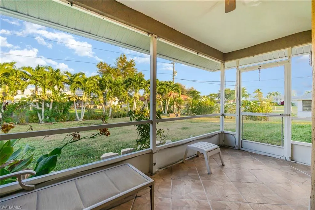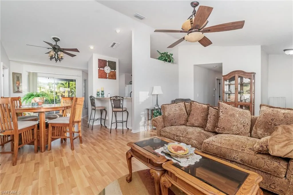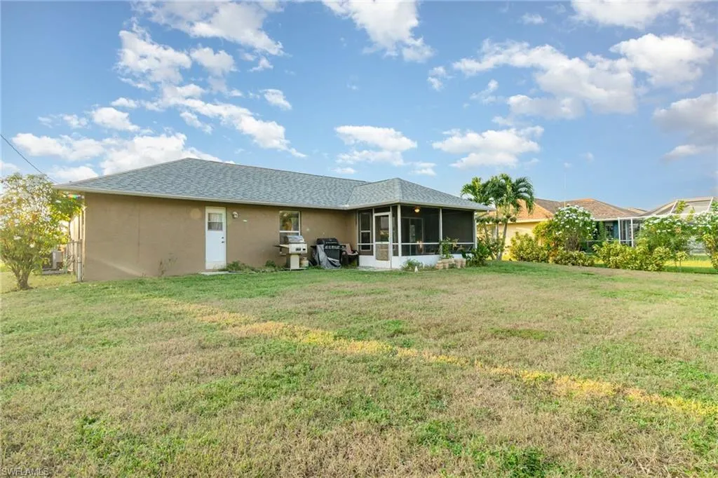 FURNISHED 3 Bedroom, 2 Bathroom, 2 Car Garage home located in Cape Coral. NO HOA FEES & NO FLOOD REQUIRED! CLICK ON THE VIRTUAL TOUR LINK 1 FOR THE VIDEO AND VIRTUAL LINK 2 FOR THE 3D TOUR. Featuring a bright & airy floor plan, high vaulted ceilings, laminate wood flooring throughout, and MORE! The open living and dining areas create an ideal setting for effortless entertaining, featuring large windows and a glass slider that fills the space with natural light. The EAT-IN kitchen offers all appliances, granite countertops, tiled backsplash, a closet pantry, and a breakfast bar for casual dining. The spacious master suite has a walk-in closet and a private bathroom with a dual sink vanity and a shower/tub combo. The guest bedrooms are on a split floor plan offering plenty of privacy, with built-in closets and a shared guest bathroom nearby. The screened-in lanai is the perfect spot to sip your morning coffee or unwind with your favorite evening beverage, taking in the beautiful Florida weather. A fully fenced backyard has lush landscaping, with plenty of room for a pool or creating your own private oasis. Conveniently located close to parks, schools, shopping, and dining. Residents enjoy nearby recreational spots like Four Mile Cove Ecological Preserve & Sun Splash Water Park, plus easy access to boating and outdoor activities along the Caloosahatchee River, with a short drive to local award-winning beaches. Schedule your showing TODAY!