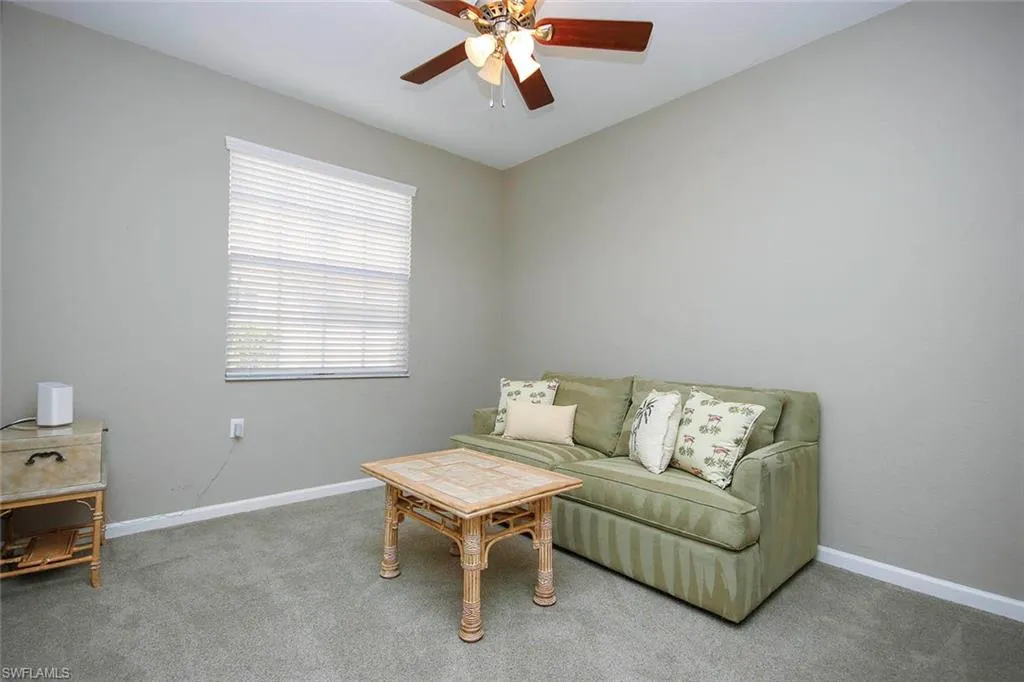 EXCELLENT SOUTHERN LAKE & GOLF COURSE VIEW in highly sought after CROWN COLONY. This 2 bedroom PLUS den, 2 car garage condo is a perfect location near the Sanibel/Fort Myers beaches, shopping & dining and Health Park hospital complex. This condo is beautifully maintained and has neutral decor throughout. The open kitchen features stainless appliances, white cabinetry and corian countertops. The living area is open too and features that VIEW! The primary suite also has the view with access to the lanai, a huge walk-in closet, tub, shower with frameless door, and dual sinks. There is an additional guest bed and bath and a den. Lightly furnished so you can start living your Florida dream right away! The fees include your master HOA fees as well as condo fees and include just about everything: hi-speed internet, cable, water& sewer, lawn care, 24 hour guard gated security, insurance on the building, community pool &spa, fitness center and tennis. This lively community has lots to offer including a Golf Club with no waitlist! You will want to put this on your list!