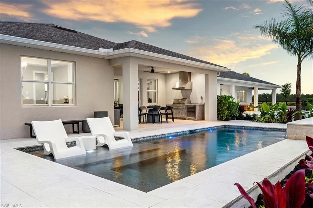 New Construction Luxury Home on Lake Babcock– Imagine stepping into your own private lakeside paradise, where a sparkling screen-enclosed pool and spa await, surrounded by an expansive paver patio perfect for entertaining or simply savoring Florida’s iconic sunsets. This breathtaking brand-new Montura floor plan is nestled in the heart of Babcock Ranch, America’s first solar-powered town, proudly featured on 60 Minutes, offering a lifestyle that blends sustainability with sophisticated luxury. Inside, the home is flooded with sunlight that dances across gorgeous Luxury Vinyl Plank flooring throughout, showcasing panoramic western-facing water views from nearly every room. The gourmet kitchen is a culinary masterpiece, boasting elegant two-toned cabinetry, shimmering quartz countertops, and a full suite of stainless steel appliances including a natural gas cooktop, making it effortless to host unforgettable gatherings. The primary suite is a serene retreat, complete with tranquil lake views and a spa-inspired bathroom featuring a freestanding soaking tub, indulgent walk-in shower, dual vanities, and exquisite designer tile finishes. Additional bedrooms share a thoughtfully designed Jack-and-Jill bath, and a versatile flex space provides endless possibilities for a home office, media room, or play area. Built to the highest energy-efficient and safety standards, this home features impact-resistant windows and doors and comes fully backed by the builder’s warranty. Discover the pinnacle of modern Florida lakeside living, where elegance, comfort, and breathtaking natural beauty converge—right here on Lake Babcock. Please see MLS supplements for interior design selections/floor plan layout.