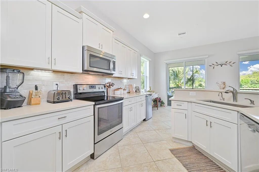 The upgraded kitchen stands out with new quartz countertops, a farmhouse-style sink, upgraded cabinetry & backspash, stainless steel appliances, and Instant Hot Water. The great room offers coffered ceilings, diagonal tile flooring, and a bright breakfast area surrounded by windows. Dual sliding glass doors open to an expansive screened lanai that provides both privacy and spectacular views.