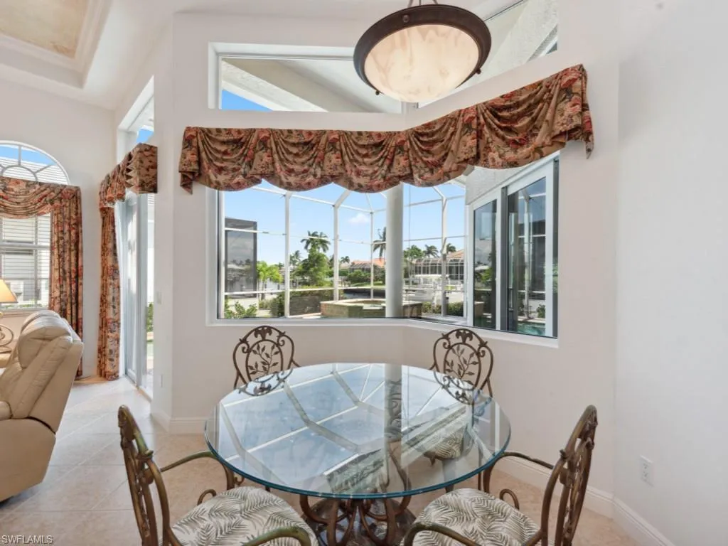 This furnished indirect access waterfront home is located on a commanding 0.37 acre corner lot in the southern part of Marco Island, spanning over 2500 square feet of living space with 3 bedrooms plus den, 2.5 bathrooms. Boasting long water views from the main living areas and primary bedroom. Oversize primary suite with sitting area, French doors, two walk in closets, expansive ensuite bathroom with dual vanities, jetted soaking tub and walk in shower. Interior features high coffered ceilings, crown molding, double tray detail, transom windows, zero corner sliders, multiple living areas, a kitchen with stainless-steel appliances and granite countertops. Two AC units, newer hot water tank and washer/dryer. Outside, there is a saltwater pool and spa with newer pump and heater, a large dock with 10,000 lift just a short boat ride out to the Gulf plus a side-entry garage with ample storage, impact rated garage door. This property is conveniently located within a mile from shopping, fine dining, parks and greenway path and white sandy beaches.