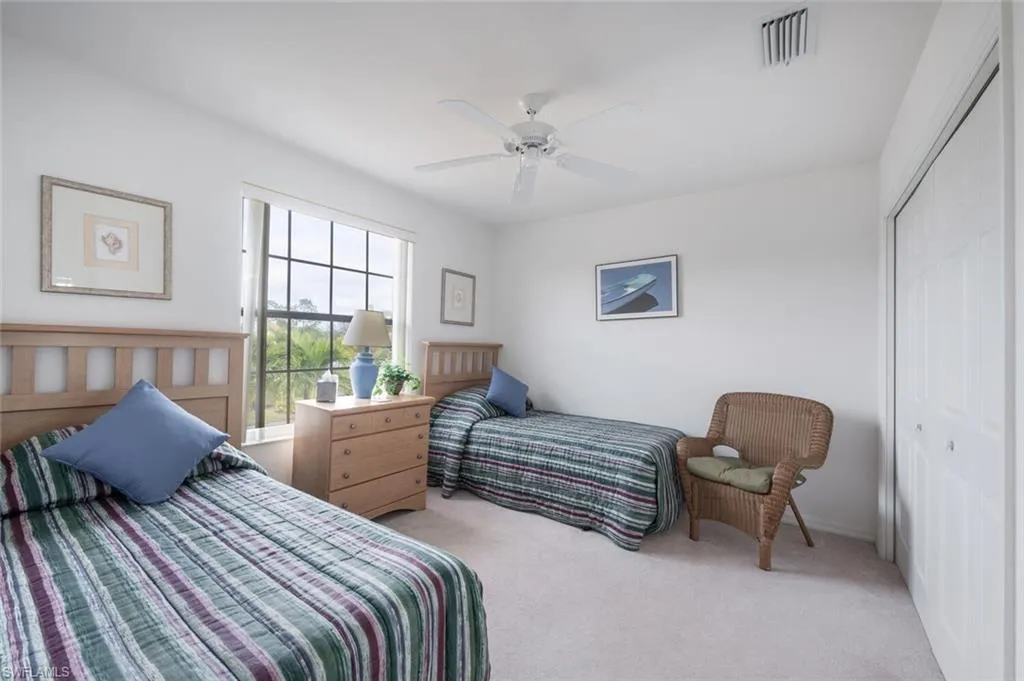 This second-floor SOCIAL membership Carriage/Coach home is currently furnished as a three-bedroom home and can easily be a 2 bedroom plus den with 2 bathrooms. There is also an attached single car garage that gives you direct entry into your private stairway. There is an excellent screened in lanai with a perfect golf course view. Every room has ample windows making it very light and bright. This home is ready to move in and has an open floor plan and is conveniently located and situated near to shopping, dining, and recreational activities. Whether you are looking for a year-round residence, seasonal residence, or an investment property, this home offers the ideal blend of comfort, nature, and style. The community pool and mailboxes are just across the street as is a community building. Glen Eagle has an excellent restaurant with indoor and outdoor dining where you will find many social community activities to enjoy with your neighbors. Social members can golf off season which are the months of May through October with fees for a round of 18 hole, 9 hole, or walking. An exclusion list is in supplements and the items being removed are identified with a pink dot.