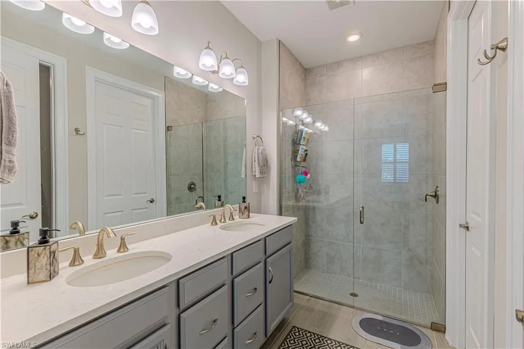 Contemporary comfort meets coastal style in this 2023 built 2-bedroom plus den, 2-bath villa, designed for modern living in the heart of Naples. This pristine residence features an open, light-filled floorplan with high ceilings, plantation shutters, and beautiful wood-looking tile flooring that flows seamlessly throughout. The chef’s kitchen features modern grey cabinetry, quartz countertops, stainless steel appliances, and a spacious breakfast bar, perfect for casual dining or entertaining. The primary suite includes a custom walk-in closet, dual-sink vanity, and large walk-in shower, while the split-bedroom layout ensures privacy for guests. The versatile den can easily serve as a third bedroom or home office. Outside you will enjoy a private screened in lanai overlooking lush, landscaped greenery, ideal for relaxing or outdoor dining. Additional highlights include a separate laundry room with built-in shelving and an attached two-car garage for added convenience. This home has been impeccably maintained and can be offered turnkey furnished for the right price. Move right in and start enjoying the Naples lifestyle. Located within the gated community of Enbrook, residents enjoy resort-style amenities including a clubhouse, resort pool, fitness center, tennis, pickleball, and bocce courts. Perfectly situated near Naples and Marco Island beaches, as well as upscale shopping, dining, and entertainment, this villa offers a vibrant yet tranquil Southwest Florida lifestyle. Experience modern design, effortless comfort, and timeless coastal charm in this beautiful move-in-ready home.