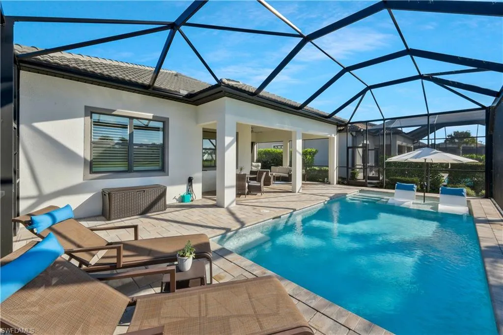 LIVE THE NAPLES LIFESTYLE IN STYLE – LUXURY HOME IN GREYHAWK AT GOLF CLUB OF THE EVERGLADES! This stunning 4-bedroom, 3-bath home located in the highly coveted Greyhawk Golf Club of the Everglades. Perfectly positioned on a premium southern exposure lot, this residence defines Naples luxury with an expansive lanai, sun deck, and extended pool featuring a relaxing sun shelf—your private outdoor oasis. Inside, a designer kitchen showcases upgraded cabinetry, high-end appliances, and elegant finishes throughout. The primary suite offers a custom-built closet and spa-inspired bath with a beautifully appointed vanity. A finished laundry room and extended, air-conditioned garage adds comfort and convenience. Enjoy world-class golf, dining, and resort amenities just steps from your door. Residents of Greyhawk enjoy a vibrant lifestyle with two clubhouses, year-round dining, a heated resort pool and lap pool, fitness center, spa, firepit, and Tiki bar. Sports enthusiasts will love the pickleball, bocce, and tennis courts, while golf lovers can enjoy the 18-hole championship course, driving range, and putting green. A dedicated Lifestyle Director curates social events to make sure everyone has an exceptional experience. With low HOA fees, no CDD, and a mandatory social membership (optional golf membership), this home is ideal for full-time residents, seasonal escapes, or investment opportunities. This is the Naples lifestyle you’ve been dreaming of!