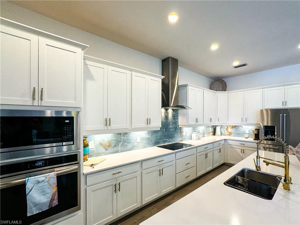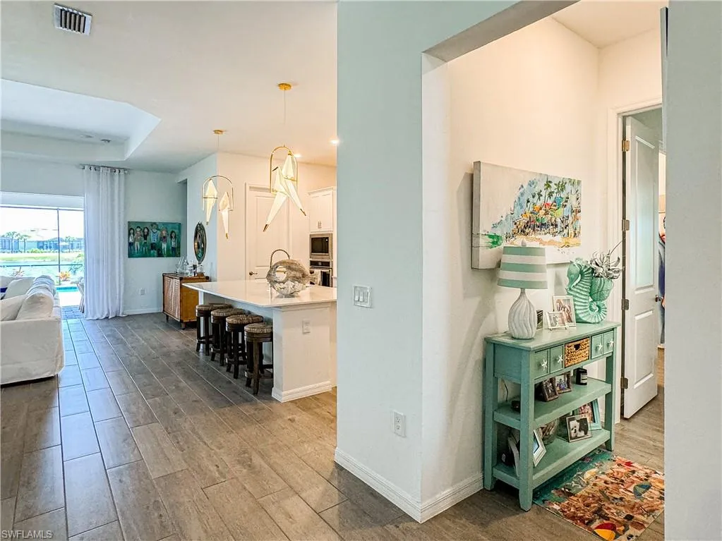 Step inside to discover wood-look tile flooring throughout, high ceilings, and abundant natural light that creates a warm, inviting atmosphere. The chef-inspired kitchen showcases quartz countertops and backsplash, modern stainless steel appliances, ample cabinetry, and a large quartz island ideal for casual dining or hosting guests.