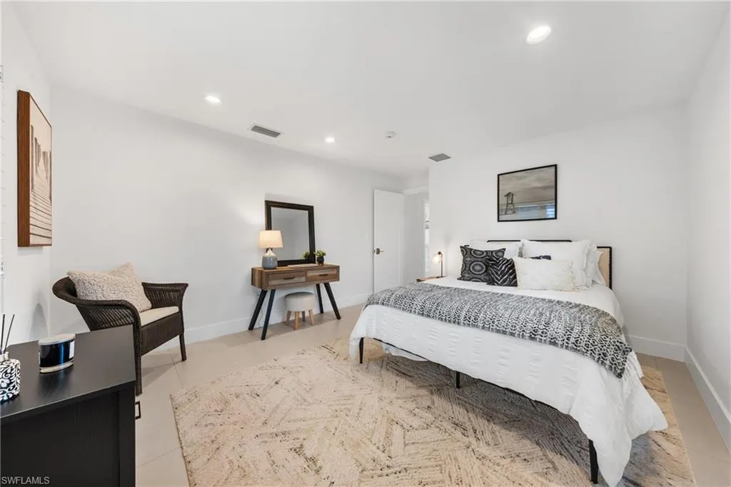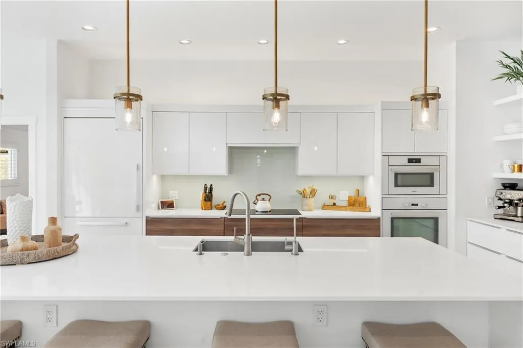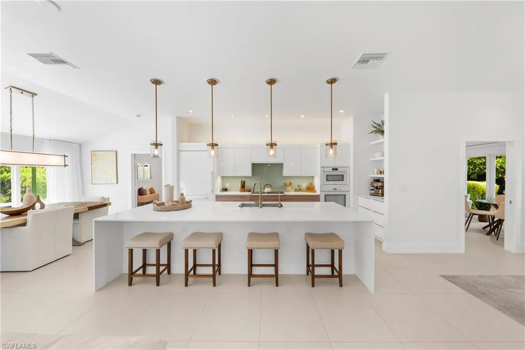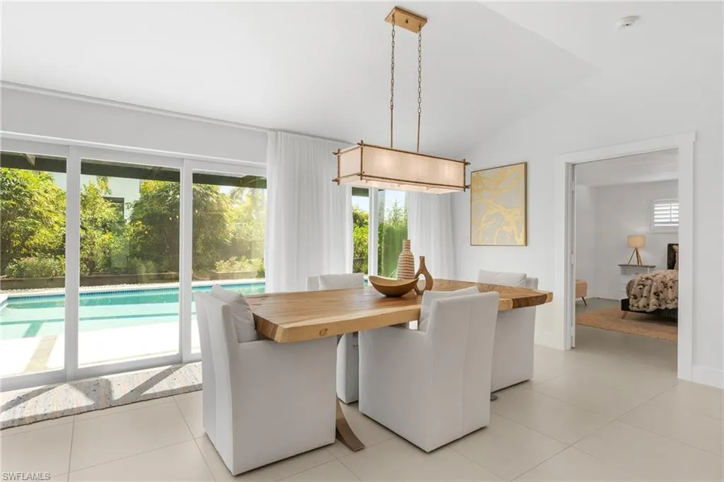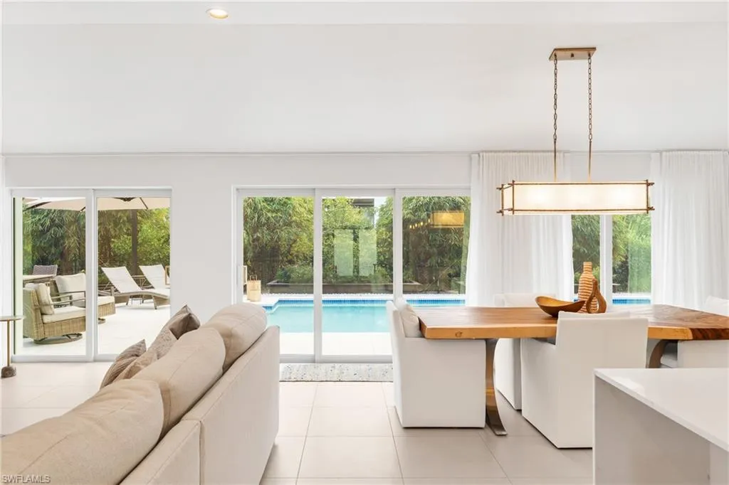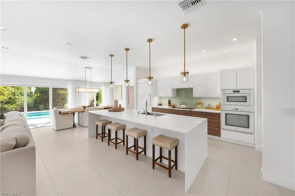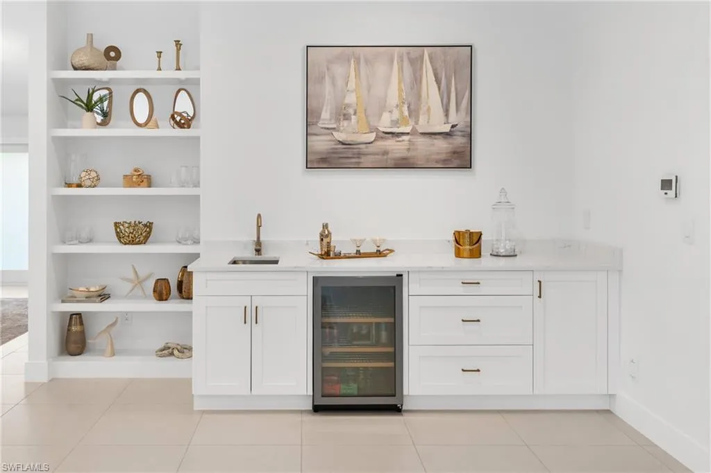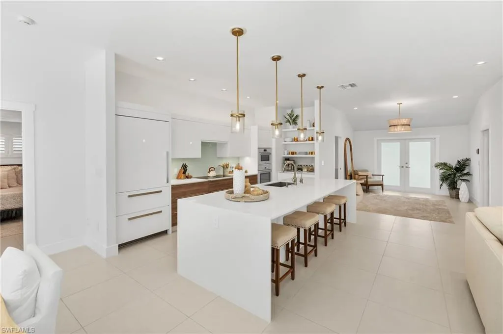 Indulge in a residence where chic sophistication meets serene comfort and luxury. This gorgeous Park Shore three bedroom plus Den and two bathroom, nearly 2,400 Sq. ft of living space, heated pool home leaves nothing to be desired with no stone left unturned with curb appeal that leaves a lasting impression. Situated WEST of US 41, you are just a short drive to the private beach afforded to Park Shore residents, Venetian Village, and tons of other shopping and dining options nearby. Greetings from the French door entryway lead you to the foyer with the den to the right and the kitchen straight ahead. The entertainer and chef alike in you will love the gorgeous kitchen with its oversized quartz island and spillway, modern appliances, coffee bar, and plentiful cabinet and counter space. Impeccable flow is enjoyed from the kitchen to the large living area with a separate wet bar which is flooded by natural light from the doors leading out to the enclosed lanai and pool area. The primary bedroom is a true retreat after a sun filled day with your double vanity, separate glam counter, walk-in closet (with built-ins) and seamless shower and tub. The den along with the two guest bedrooms enjoy tons of natural light along with easy access to the second full bathroom. Your private enclosed lanai with its gorgeous heated pool is the perfect setting for an evening spent at home or a gathering. The grounds beyond the portrait screens are stunning and will leave even the most discerning landscape architect green with envy. Sip your morning coffee or tea out on the front courtyard sequestered by mature and tall hedges and a gorgeous stately tree. Peace of mind is enhanced with tile flooring throughout, laundry in residence (with 2 laundry tubs, 2 car garage, and built in shelving in the garage as well. This property sits just 10 minutes from famed 5th Ave S, a 5 minute drive to the beach, and a top rated school system.