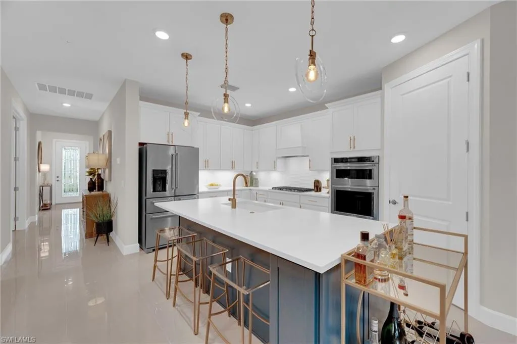 Every inch of this home has been thoughtfully designed and meticulously maintained. Enjoy a COVERED EXTENDED LANAI, ZERO-CORNER SLIDING GLASS DOORS, and a FULL OUTDOOR KITCHEN, creating seamless indoor-outdoor living. Inside, the open-concept layout shines with 8-FOOT DOORS, 5¼” BASEBOARDS, TRAY CEILING in the Gathering Room, CUSTOM LIGHTING and POLISHED LUXURY TILE THROUGHOUT — no carpet anywhere. The gorgeous KITCHEN showcases a rare built-in layout no longer offered by Pulte, complete with a KITCHENAID gas cooktop and wall oven, upgraded refrigerator, LEATHERED QUARTZ COUNTERTOPS, upgraded cabinetry, under-cabinet lighting and a custom pantry. The laundry room features CUSTOM CABINETRY and a utility sink, while a separate utility room provides additional storage with CUSTOM CABINETRY. The EXTENDED 4-FOOT GARAGE includes a painted floor, overhead storage racks and room for a golf cart or hobby area. The PRIMARY SUITE offers peaceful preserve views, a SPA-LIKE BATH with LEATHERED QUARTZ COUNTERTOPS, dual vanities, walk-in shower, and a CUSTOM-DESIGNED CLOSET. Two additional guest bedrooms include one with a BAY WINDOW large enough for a king-sized bed, and the ENCLOSED DEN offers versatility for remote work, hobbies, or guests. Additional upgrades include a WHOLE-HOME SOLAR POWERED WATER FILTRATION SYSTEM, 7 EXTERIOR SECURITY CAMERAS, and hurricane panel shutters for peace of mind. Located in Estero’s highly sought-after VERDANA VILLAGE, a NATURAL GAS community known for its resort-style amenities: an INDOOR SPORTS COMPLEX (with 4 indoor pickleball courts, 2 tennis courts and a full basketball gym), 12 OUTDOOR PICKLEBALL COURTS, a state of the art fitness center with yoga & strength training, and THREE ONSITE DINING OPTIONS including a Café, Drift Restaurant, and Craft Lounge. Just outside the gates, you’ll find the Shops at Verdana Village including a Publix grocery store, Dunkin Donuts, Italian restaurant, nail salon, UPS store, and a bank—all just a short golf cart ride away! Experience this better than new home with top-tier finishes, unmatched privacy, and resort-level amenities!