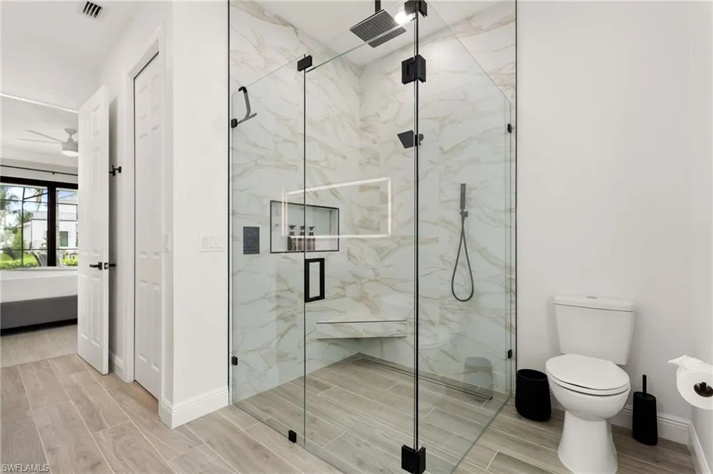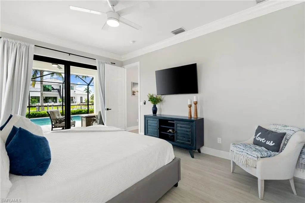 The primary suite offers a peaceful retreat with pool access, a spacious walk-in closet, and a luxurious spa bath complete with double vanities, backlit mirrors, a soaking tub, and a large multi-head shower. Guests enjoy privacy in beautifully appointed bedrooms and an upgraded bath with modern finishes and a rain shower.