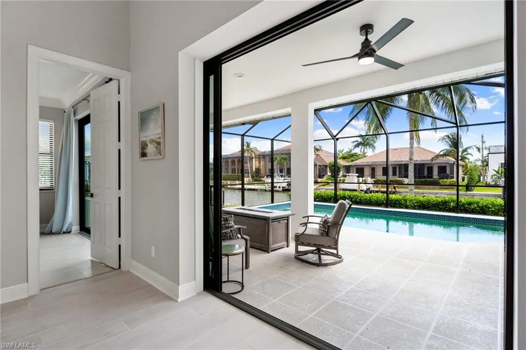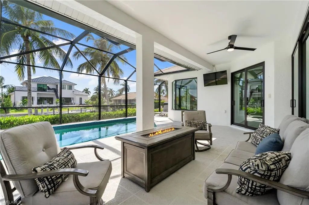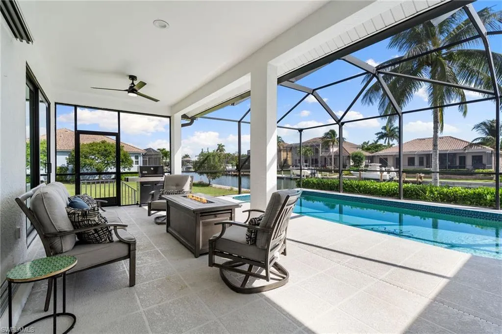 Set on an oversized lot with approximately 100 feet of water frontage, this home provides a boater’s dream location—quick Gulf access and plenty of room to envision a future dock or lift. The southern exposure ensures all-day sun and glowing sunsets over the screened lanai, where you’ll find a heated pool, outdoor TV, and fire-pit lounge area for year-round enjoyment.